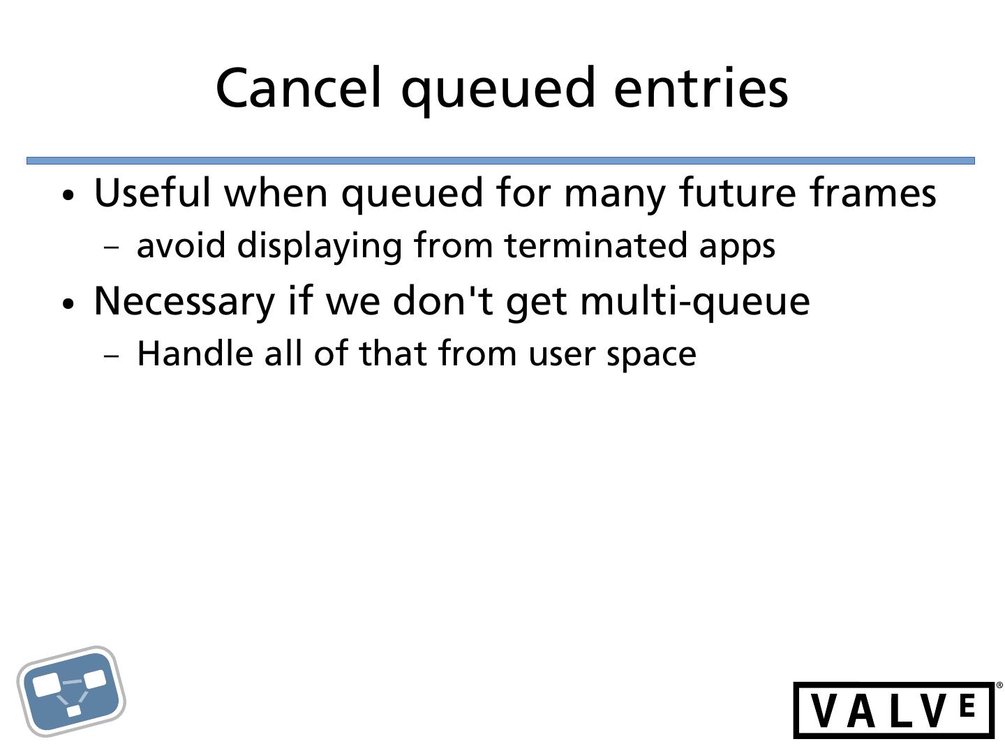25 . Cancel queued entries ● Useful when queued for many future frames – avoid displaying from terminated apps ● Necessary if we don't get multi-queue – Handle all of that from user space