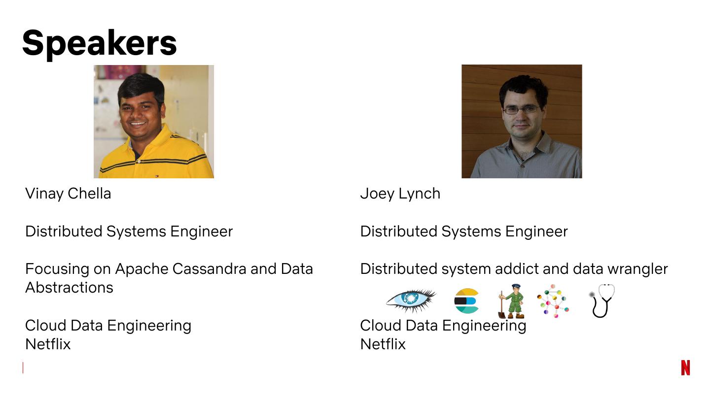 2 .Speakers Vinay Chella Joey Lynch Distributed Systems Engineer Distributed Systems Engineer Focusing on Apache Cassandra and Data Distributed system addict and data wrangler Abstractions Cloud Data Engineering Cloud Data Engineering Netflix Netflix