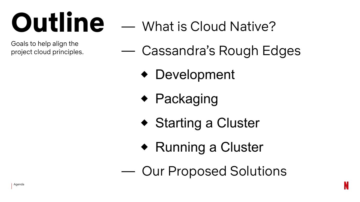 3 .Outline — What is Cloud Native? Goals to help align the project cloud principles. — Cassandra’s Rough Edges ◆ Development ◆ Packaging ◆ Starting a Cluster ◆ Running a Cluster — Our Proposed Solutions Agenda