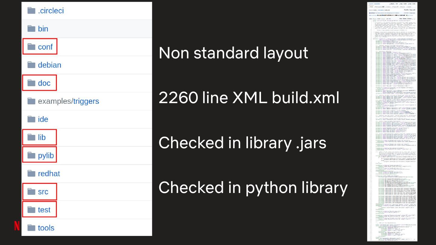 17 .Non standard layout 2260 line XML build.xml Checked in library .jars Checked in python library