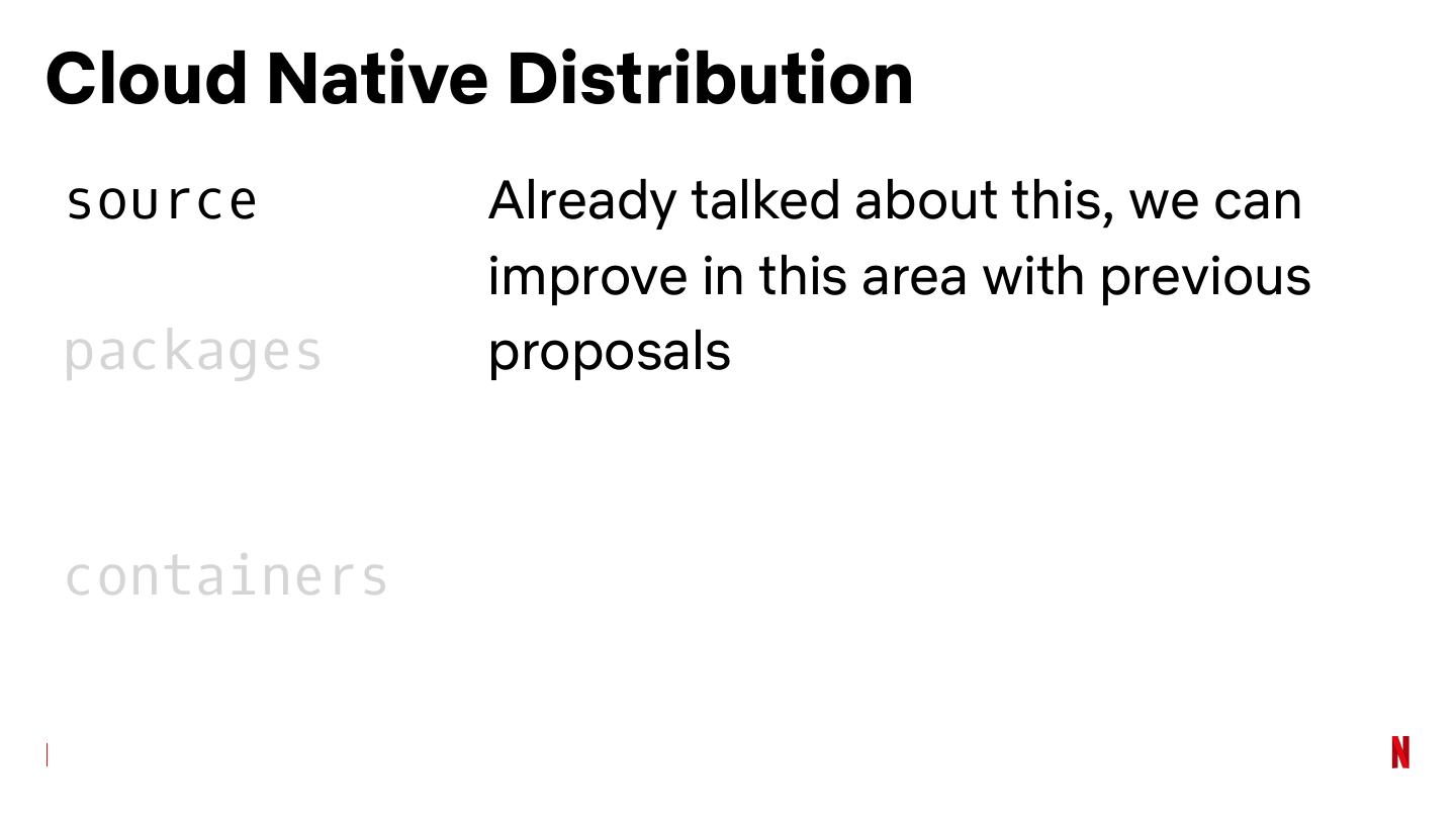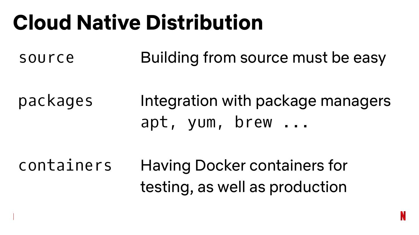 28 .Cloud Native Distribution source Building from source must be easy packages Integration with package managers apt, yum, brew ... containers Having Docker containers for testing, as well as production