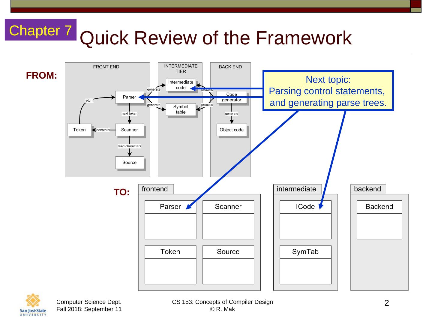 2 .2 Quick Review of the Framework FROM: TO: Next topic: Parsing control statements, and generating parse trees. Chapter 7