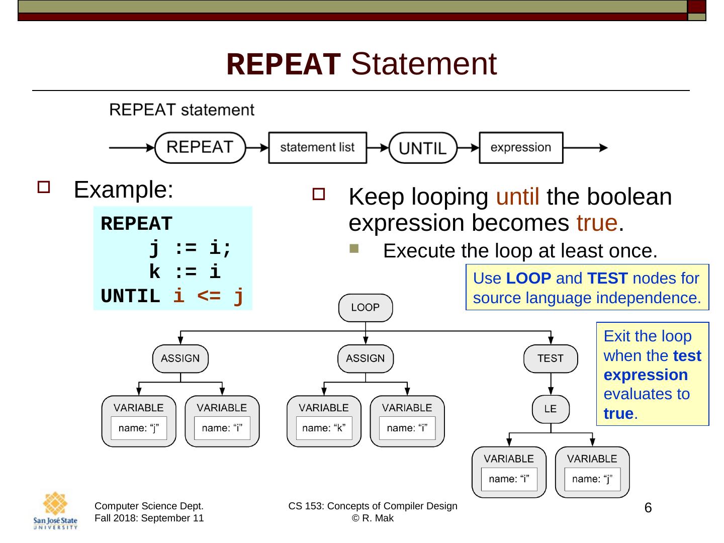 6 .6 REPEAT Statement Example: Keep looping until the boolean expression becomes true . Execute the loop at least once. Use LOOP and TEST nodes for source language independence. Exit the loop when the test expression evaluates to true . REPEAT j := i ; k := i UNTIL i <= j