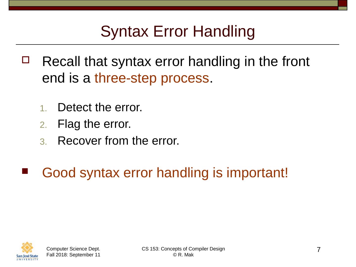 7 .7 Syntax Error Handling Recall that syntax error handling in the front end is a three-step process . Detect the error. Flag the error. Recover from the error. Good syntax error handling is important!