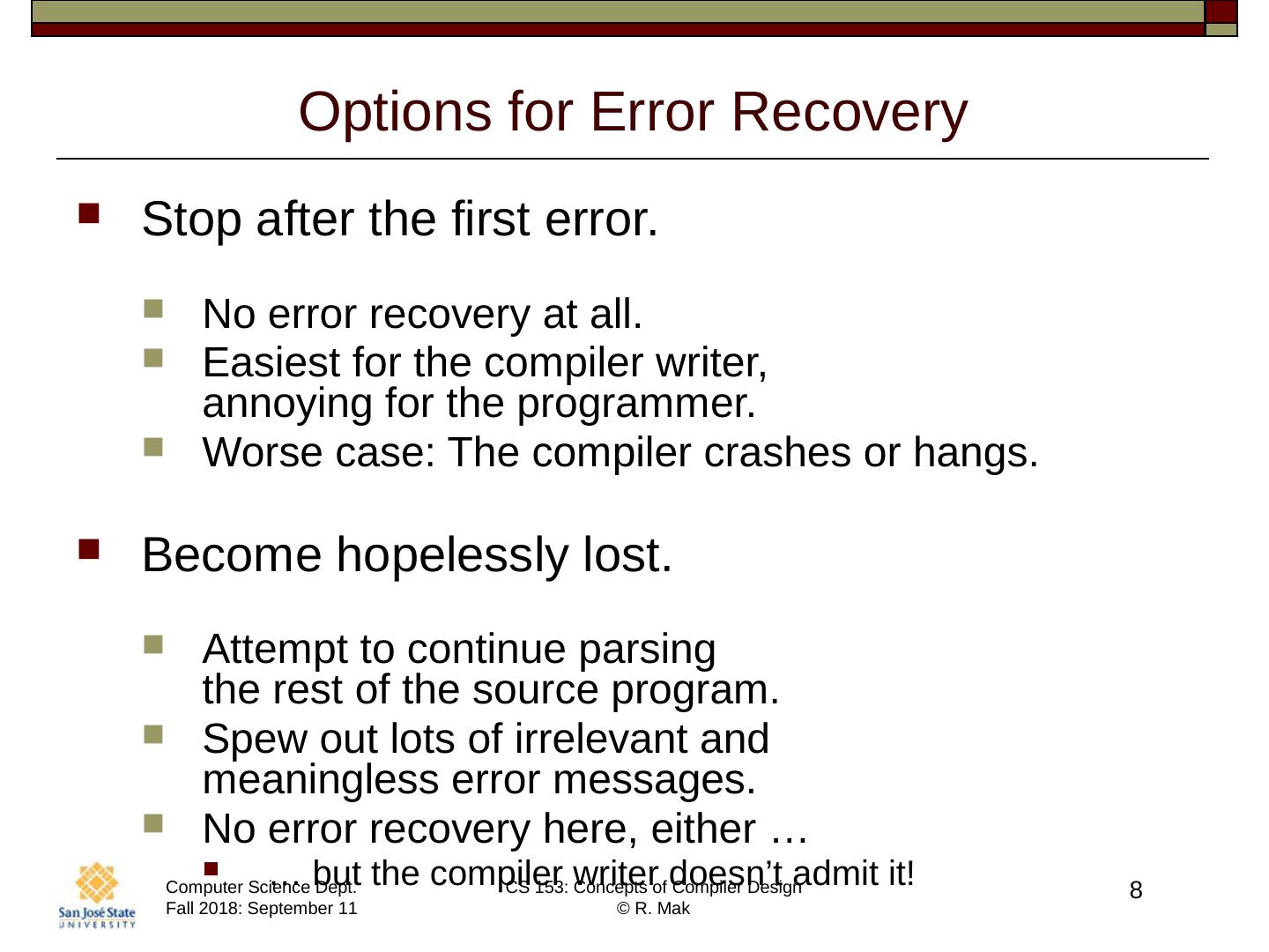 8 .8 Options for Error Recovery Stop after the first error. No error recovery at all. Easiest for the compiler writer, annoying for the programmer. Worse case: The compiler crashes or hangs. Become hopelessly lost. Attempt to continue parsing the rest of the source program. Spew out lots of irrelevant and meaningless error messages. No error recovery here, either … … but the compiler writer doesn ’ t admit it!