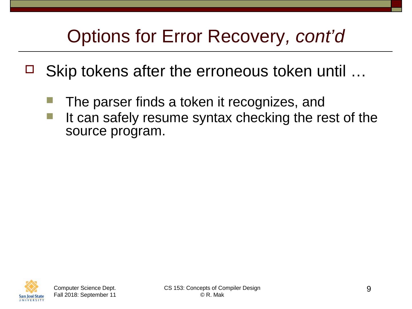 9 .9 Options for Error Recovery , cont’d Skip tokens after the erroneous token until … The parser finds a token it recognizes, and It can safely resume syntax checking the rest of the source program.