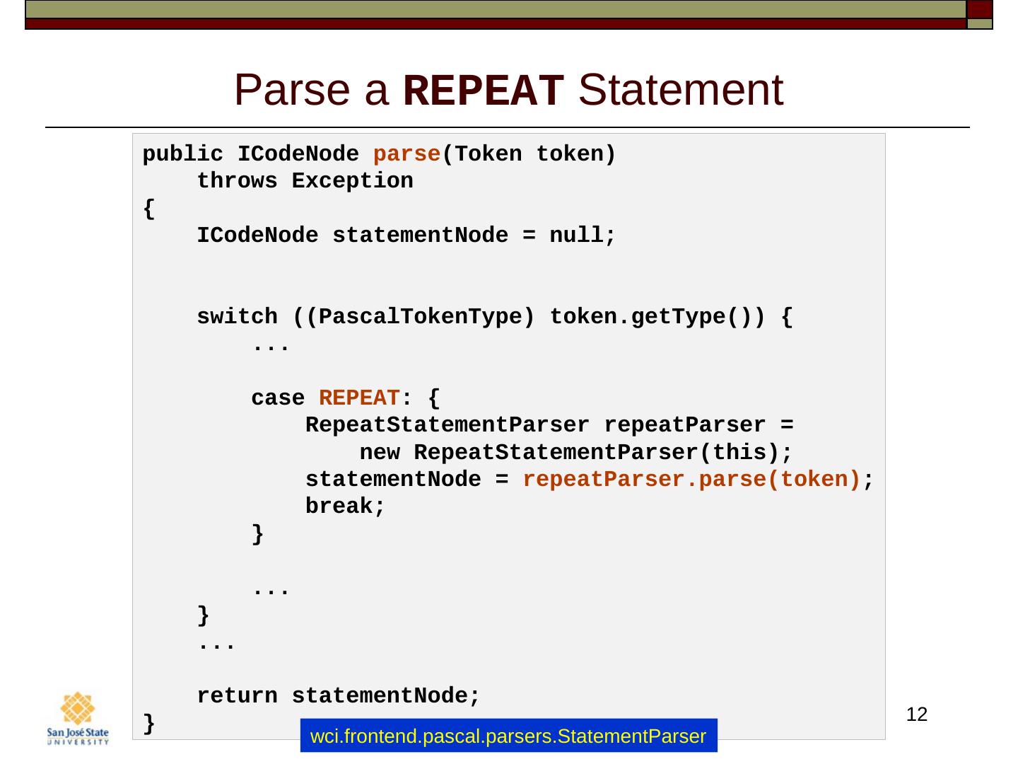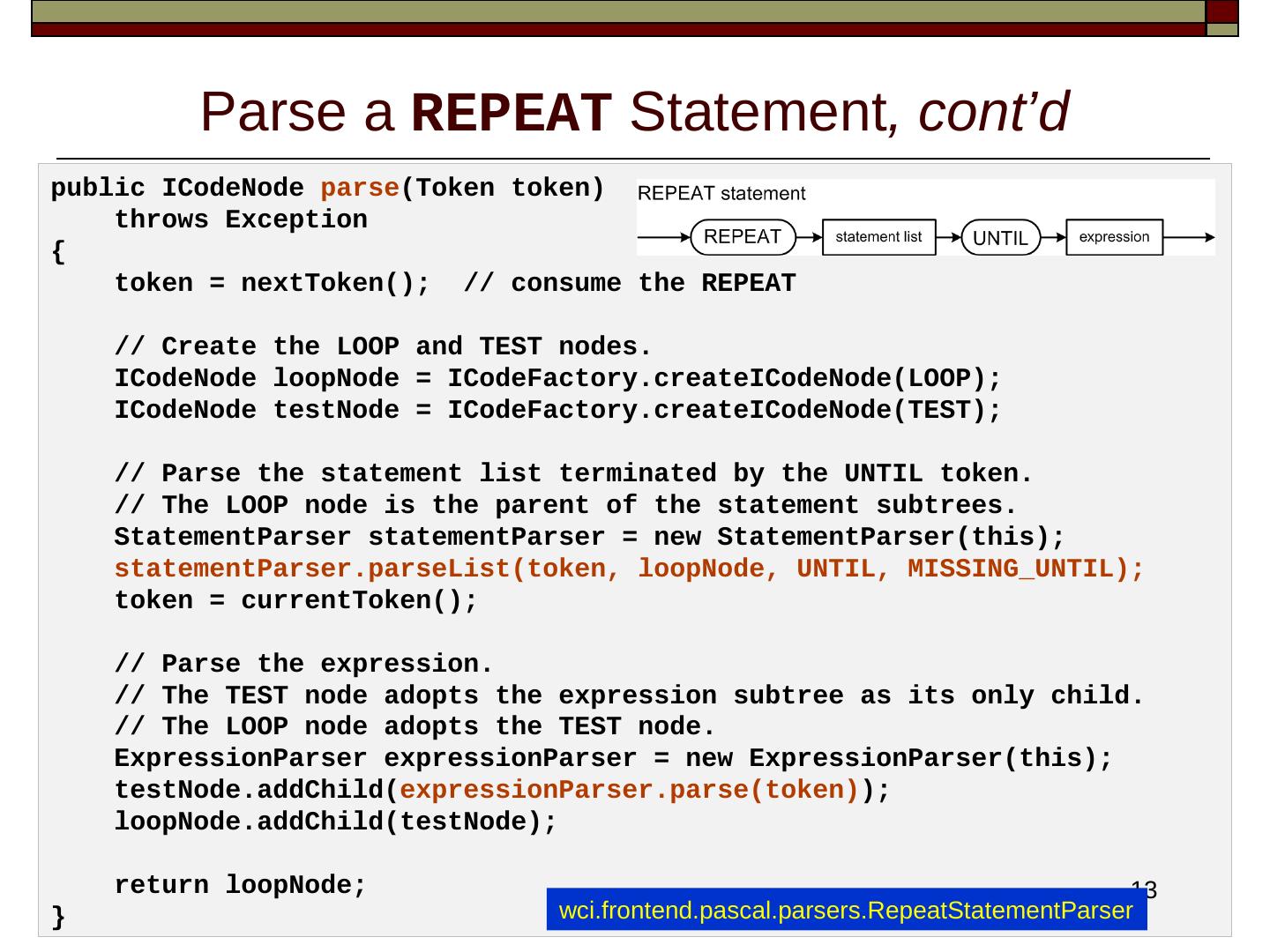 12 .Parse a REPEAT Statement 12 public ICodeNode parse (Token token) throws Exception { ICodeNode statementNode = null; switch (( PascalTokenType ) token.getType ()) { ... case REPEAT : { RepeatStatementParser repeatParser = new RepeatStatementParser (this); statementNode = repeatParser.parse (token) ; break; } ... } ... return statementNode ; } wci.frontend.pascal.parsers.StatementParser