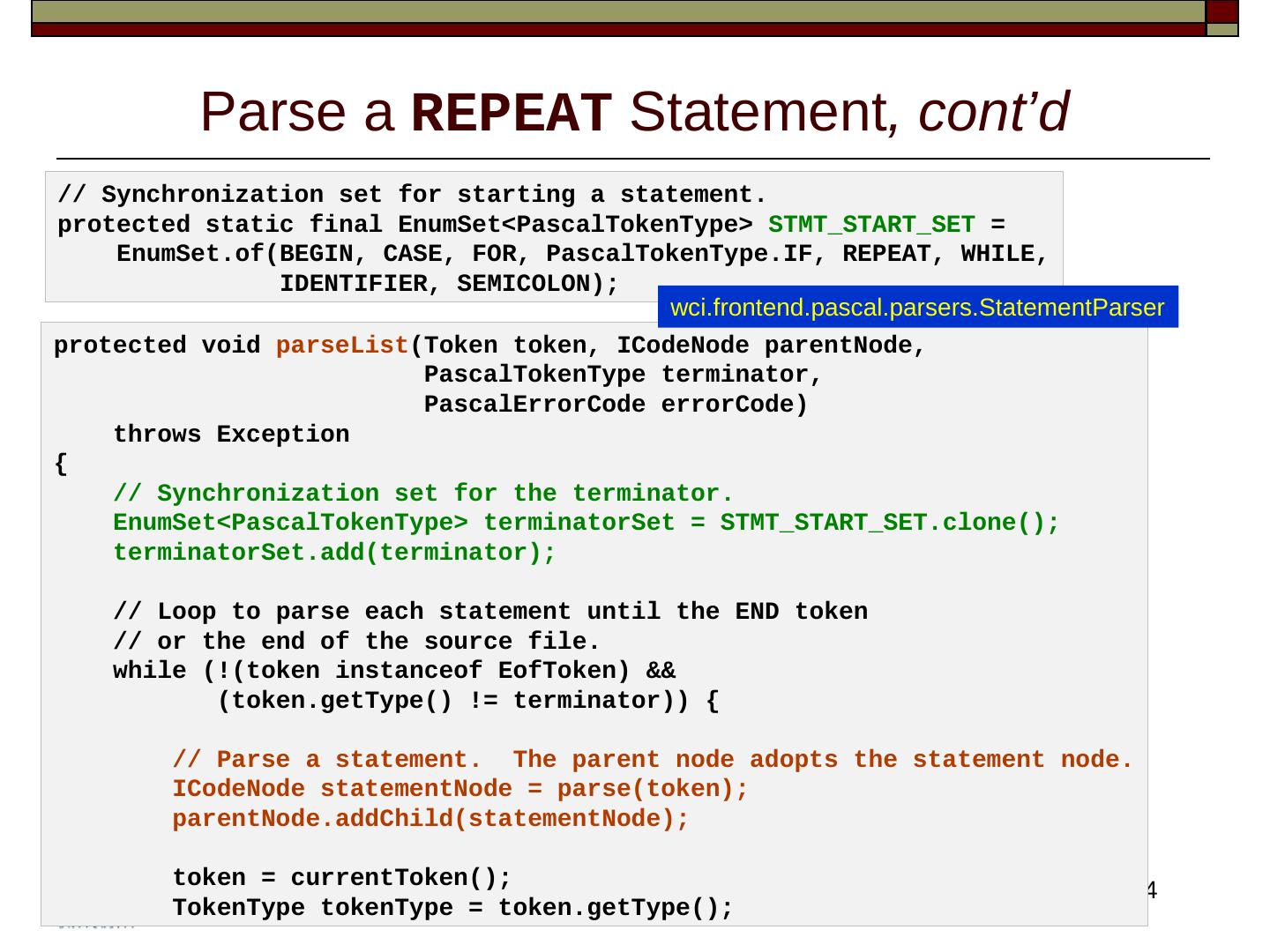 14 .Parse a REPEAT Statement , cont’d 14 protected void parseList (Token token, ICodeNode parentNode , PascalTokenType terminator, PascalErrorCode errorCode ) throws Exception { // Synchronization set for the terminator. EnumSet < PascalTokenType > terminatorSet = STMT_START_SET.clone (); terminatorSet.add (terminator); // Loop to parse each statement until the END token // or the end of the source file. while (!(token instanceof EofToken ) && ( token.getType () != terminator)) { // Parse a statement. The parent node adopts the statement node. ICodeNode statementNode = parse(token); parentNode.addChild ( statementNode ); token = currentToken (); TokenType tokenType = token.getType (); // Synchronization set for starting a statement. protected static final EnumSet < PascalTokenType > STMT_START_SET = EnumSet.of (BEGIN, CASE, FOR, PascalTokenType.IF , REPEAT, WHILE, IDENTIFIER, SEMICOLON); wci.frontend.pascal.parsers.StatementParser