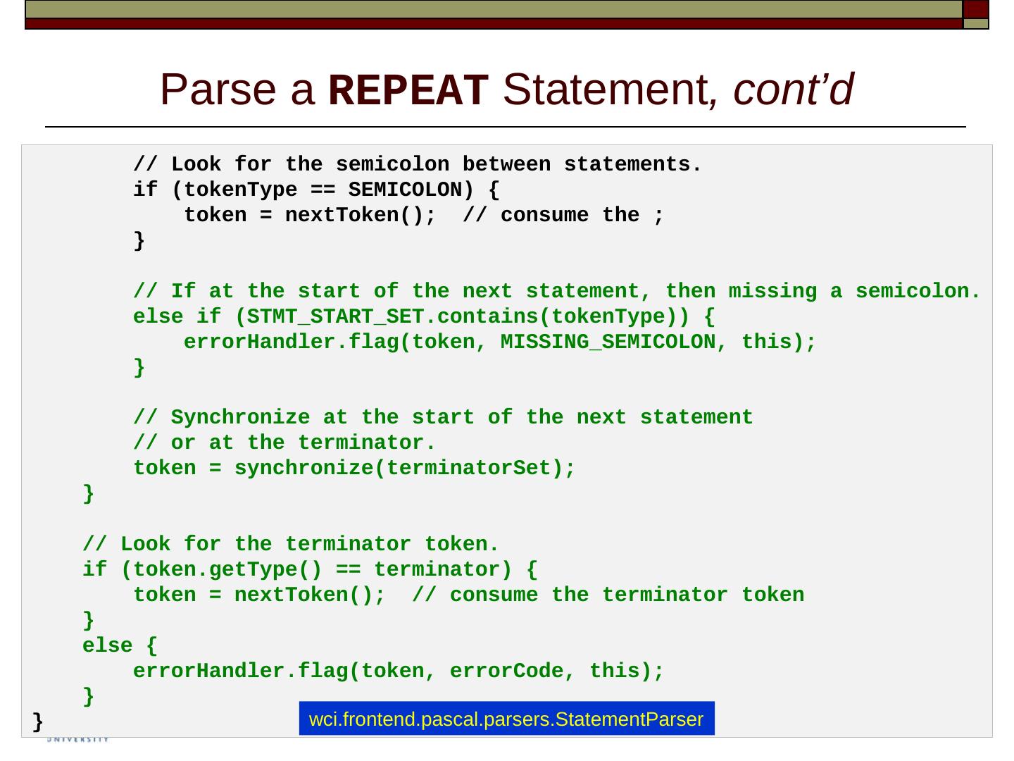 15 .Parse a REPEAT Statement , cont’d 15 // Look for the semicolon between statements. if ( tokenType == SEMICOLON) { token = nextToken (); // consume the ; } // If at the start of the next statement, then missing a semicolon. else if ( STMT_START_SET.contains ( tokenType )) { errorHandler.flag (token, MISSING_SEMICOLON, this); } // Synchronize at the start of the next statement // or at the terminator. token = synchronize( terminatorSet ); } // Look for the terminator token. if ( token.getType () == terminator) { token = nextToken (); // consume the terminator token } else { errorHandler.flag (token, errorCode , this); } } wci.frontend.pascal.parsers.StatementParser