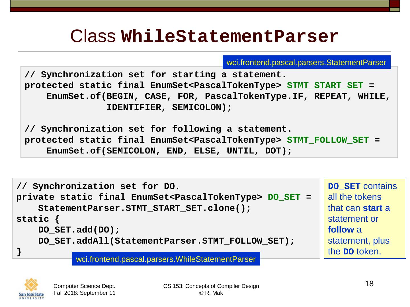 18 .18 Class WhileStatementParser // Synchronization set for DO. private static final EnumSet < PascalTokenType > DO_SET = StatementParser.STMT_START_SET.clone (); static { DO_SET.add (DO); DO_SET.addAll ( StatementParser.STMT_FOLLOW_SET ); } // Synchronization set for starting a statement. protected static final EnumSet < PascalTokenType > STMT_START_SET = EnumSet.of (BEGIN, CASE, FOR, PascalTokenType.IF , REPEAT, WHILE, IDENTIFIER, SEMICOLON); // Synchronization set for following a statement. protected static final EnumSet < PascalTokenType > STMT_FOLLOW_SET = EnumSet.of (SEMICOLON, END, ELSE, UNTIL, DOT); DO_SET contains all the tokens that can start a statement or follow a statement, plus the DO token. wci.frontend.pascal.parsers.StatementParser wci.frontend.pascal.parsers.WhileStatementParser