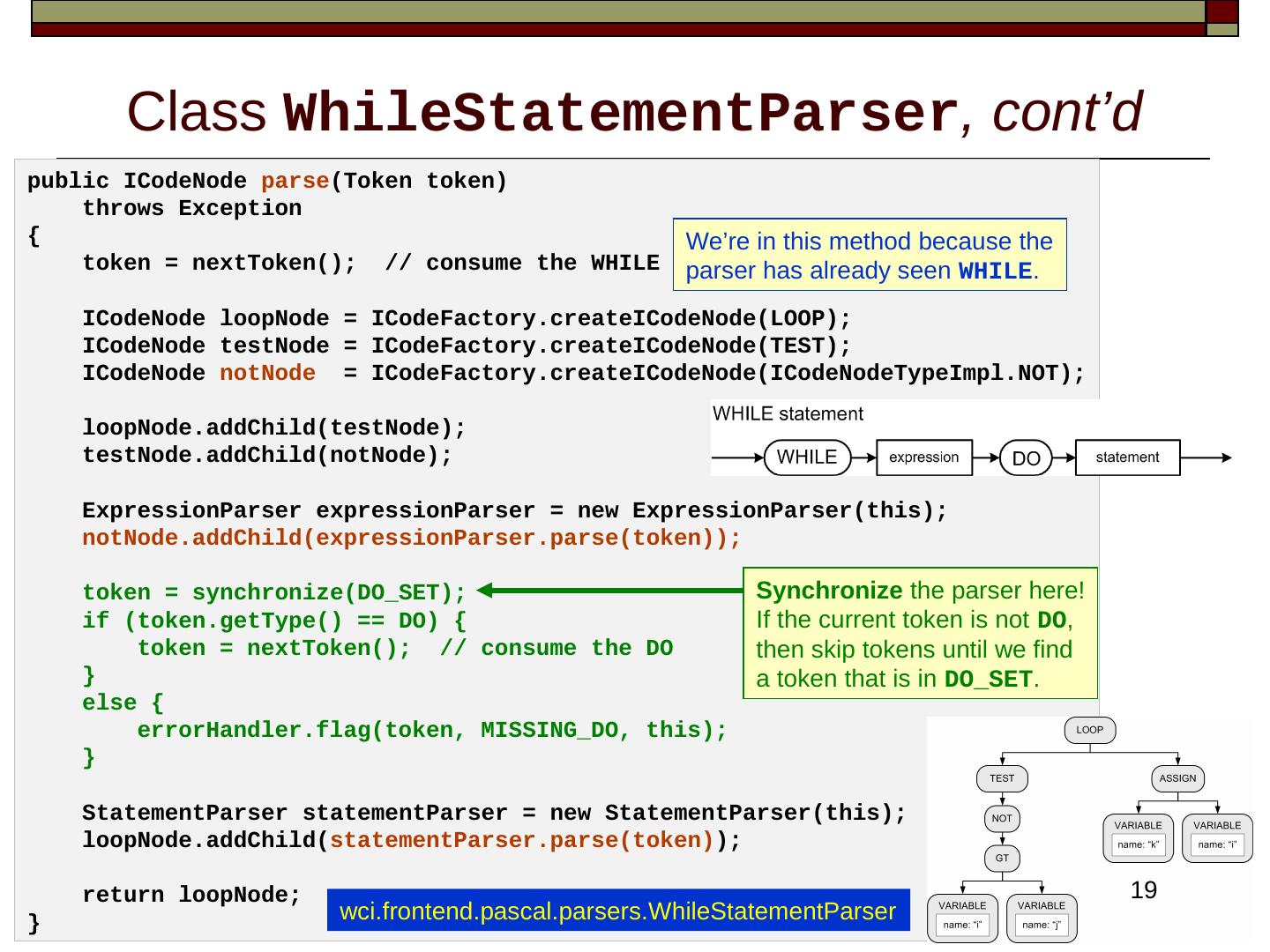 19 .public ICodeNode parse (Token token) throws Exception { token = nextToken (); // consume the WHILE ICodeNode loopNode = ICodeFactory.createICodeNode (LOOP); ICodeNode testNode = ICodeFactory.createICodeNode (TEST); ICodeNode notNode = ICodeFactory.createICodeNode ( ICodeNodeTypeImpl.NOT ); loopNode.addChild ( testNode ); testNode.addChild ( notNode ); ExpressionParser expressionParser = new ExpressionParser (this); notNode.addChild ( expressionParser.parse (token)); token = synchronize(DO_SET); if ( token.getType () == DO) { token = nextToken (); // consume the DO } else { errorHandler.flag (token, MISSING_DO, this); } StatementParser statementParser = new StatementParser (this); loopNode.addChild ( statementParser.parse (token) ); return loopNode ; } 19 Class WhileStatementParser , cont ’ d Synchronize the parser here! If the current token is not DO , then skip tokens until we find a token that is in DO_SET . We ’ re in this method because the parser has already seen WHILE . wci.frontend.pascal.parsers.WhileStatementParser