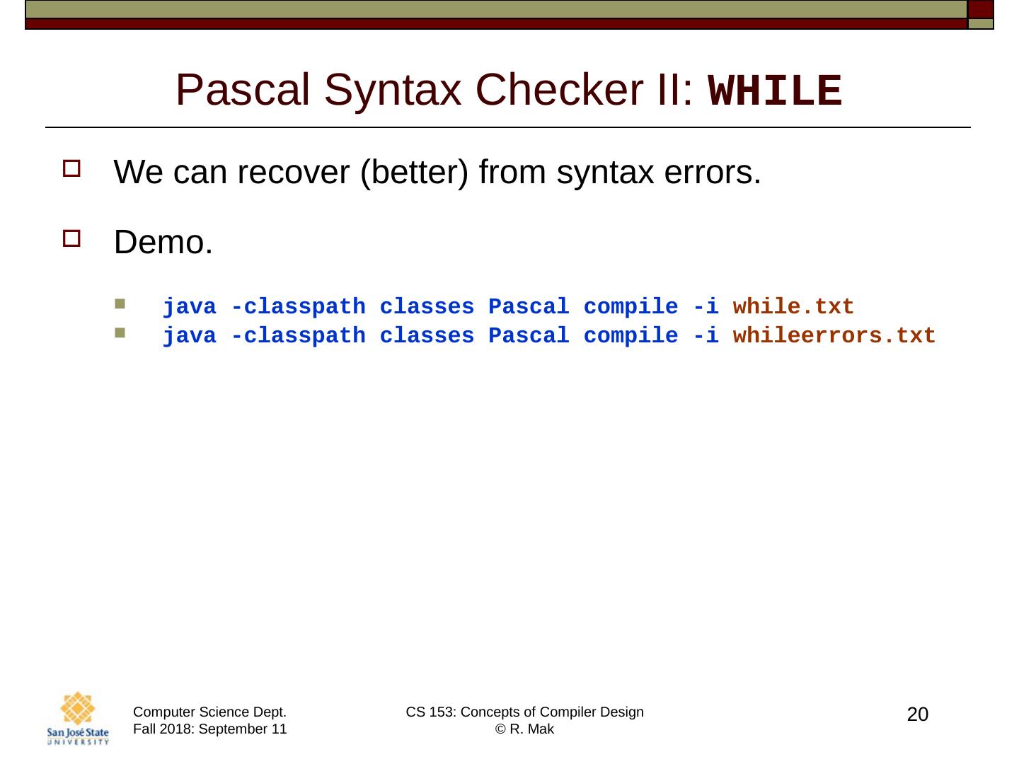 20 .20 Pascal Syntax Checker II: WHILE We can recover (better) from syntax errors. Demo. java - classpath classes Pascal compile - i while.txt java - classpath classes Pascal compile - i whileerrors.txt