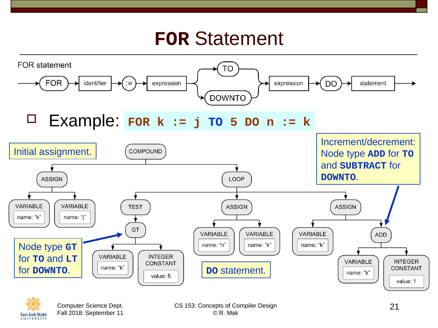 21 .21 FOR Statement Example: Initial assignment. Node type GT for TO and LT for DOWNTO . DO statement. Increment/decrement: Node type ADD for TO and SUBTRACT for DOWNTO . FOR k := j TO 5 DO n := k