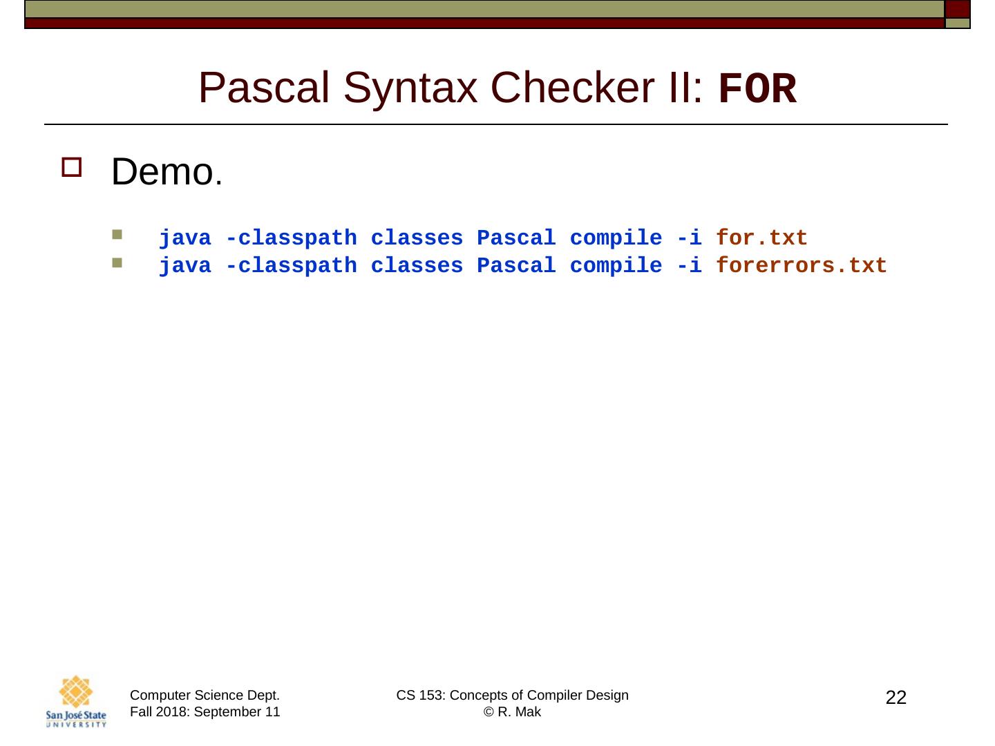 22 .22 Pascal Syntax Checker II: FOR Demo . java - classpath classes Pascal compile - i for.txt java - classpath classes Pascal compile - i forerrors.txt