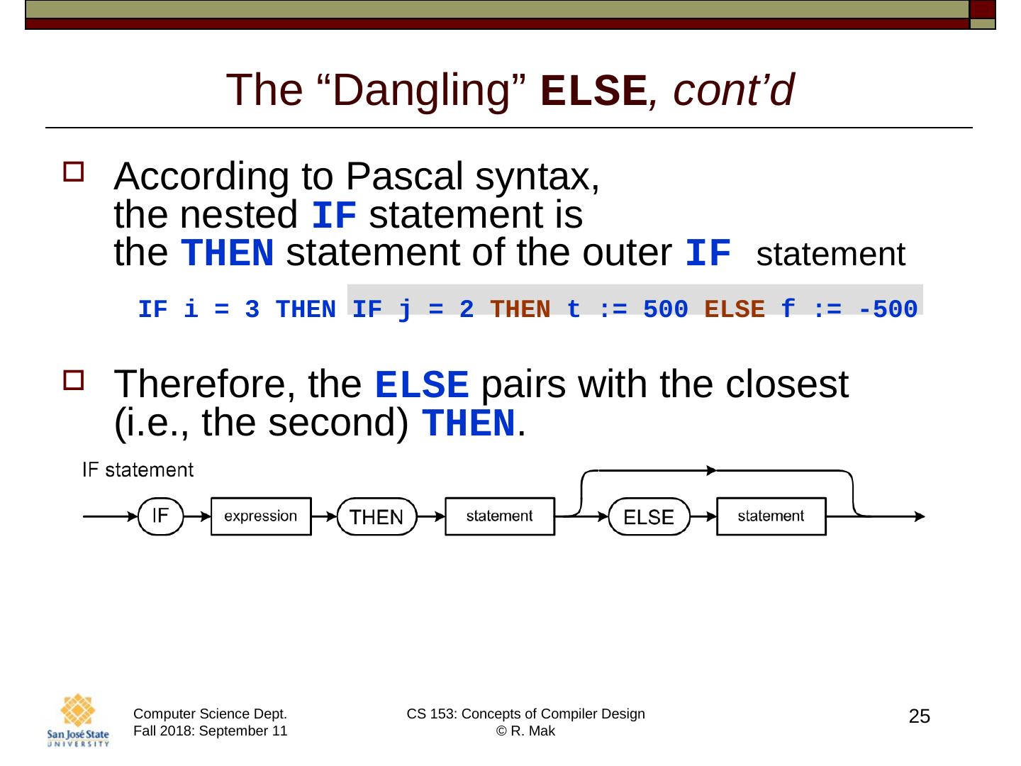 25 .25 The “ Dangling ” ELSE , cont’d According to Pascal syntax, the nested IF statement is the THEN statement of the outer IF statement IF i = 3 THEN IF j = 2 THEN t := 500 ELSE f := -500 Therefore, the ELSE pairs with the closest (i.e., the second) THEN .