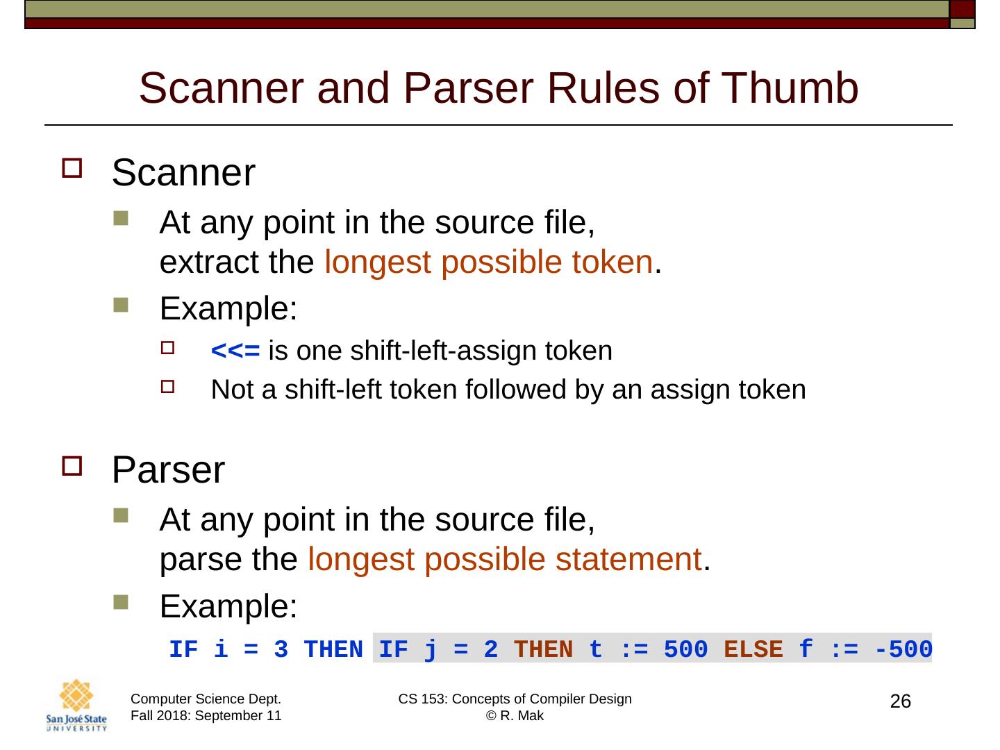 26 .26 Scanner and Parser Rules of Thumb Scanner At any point in the source file, extract the longest possible token . Example: <<= is one shift-left-assign token Not a shift-left token followed by an assign token Parser At any point in the source file, parse the longest possible statement . Example: IF i = 3 THEN IF j = 2 THEN t := 500 ELSE f := -500