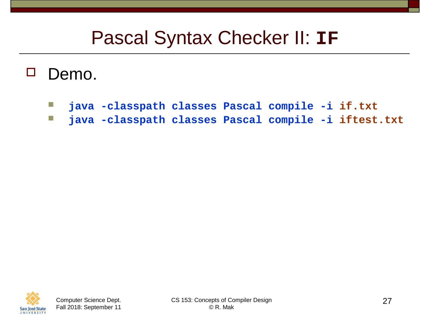 27 .27 Pascal Syntax Checker II: IF Demo. java - classpath classes Pascal compile - i if.txt java - classpath classes Pascal compile - i iftest.txt