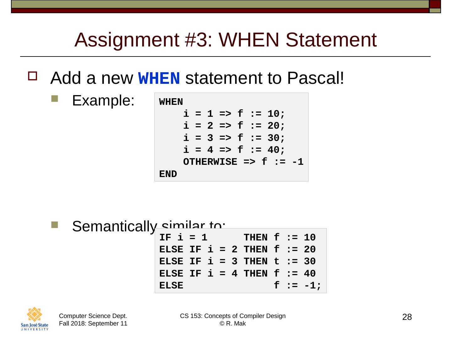 28 .Assignment #3: WHEN Statement Add a new WHEN statement to Pascal! Example: Semantically similar to: 28 WHEN i = 1 => f := 10; i = 2 => f := 20; i = 3 => f := 30; i = 4 => f := 40; OTHERWISE => f := -1 END IF i = 1 THEN f := 10 ELSE IF i = 2 THEN f := 20 ELSE IF i = 3 THEN t := 30 ELSE IF i = 4 THEN f := 40 ELSE f := -1;