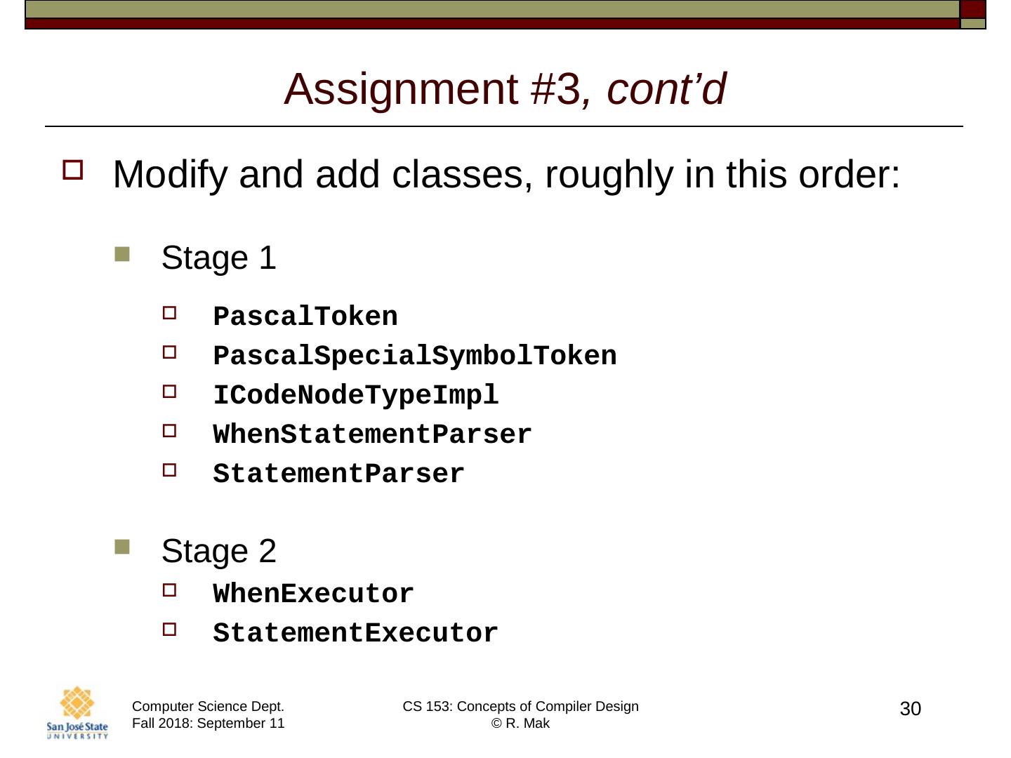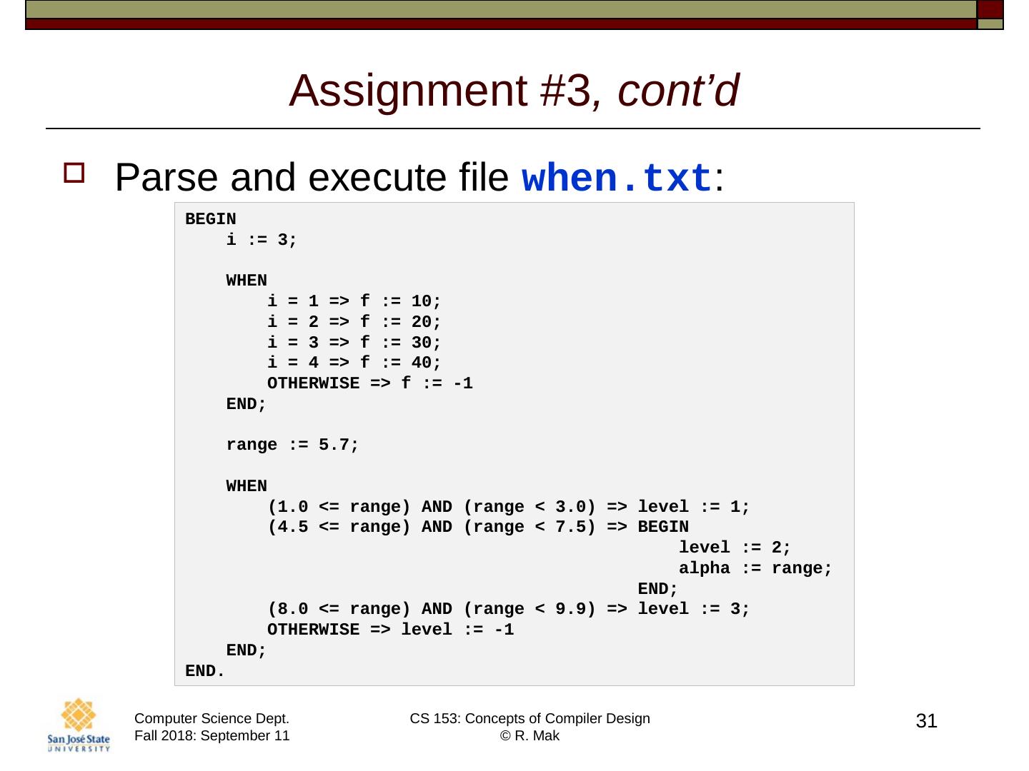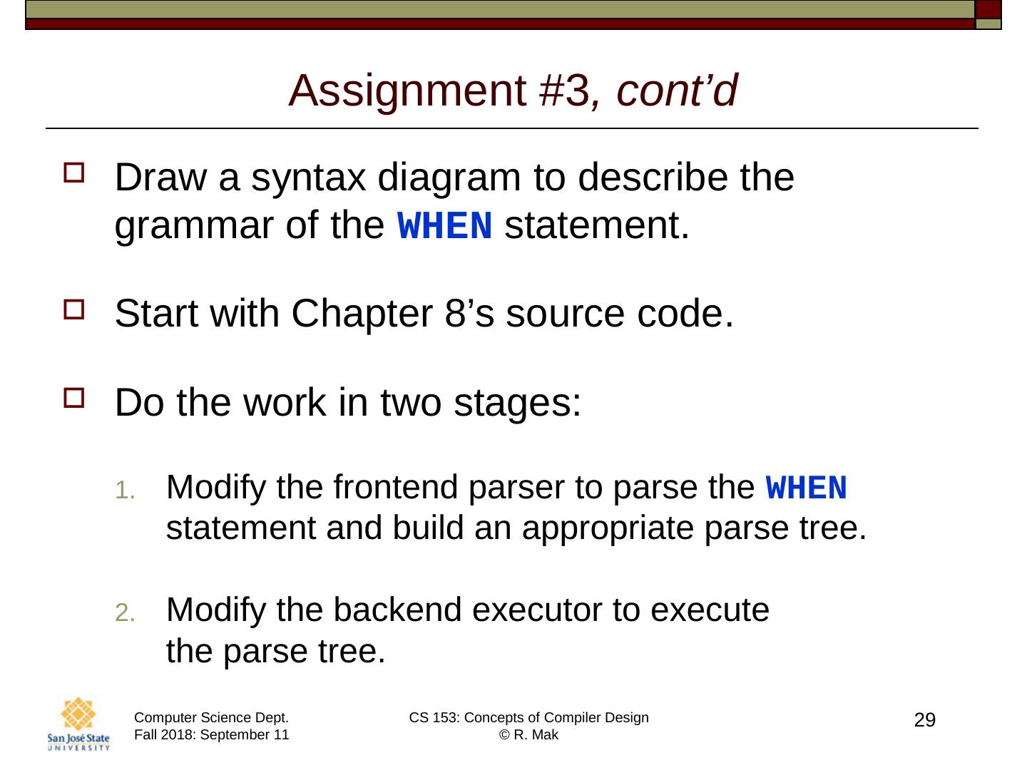 29 .Assignment #3 , cont’d Draw a syntax diagram to describe the grammar of the WHEN statement. Start with Chapter 8’s source code. Do the work in two stages: Modify the frontend parser to parse the WHEN statement and build an appropriate parse tree. Modify the backend executor to execute the parse tree. 29