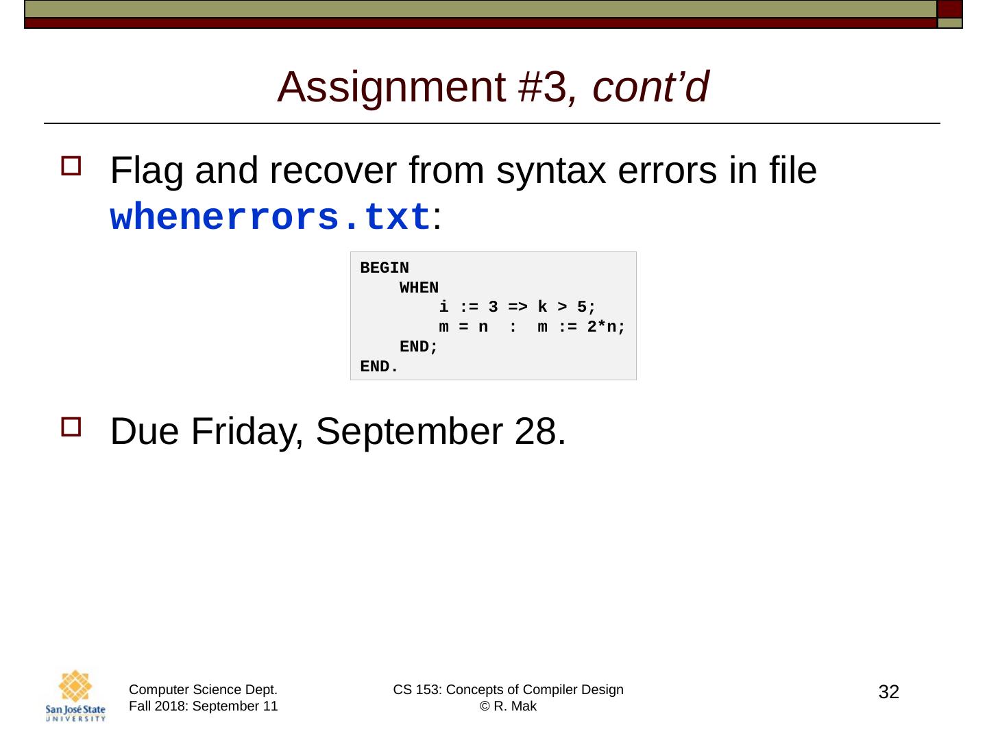 1 .CS 153: Concepts of Compiler Design September 11 Class Meeting Department of Computer Science San Jose State University Fall 2018 Instructor: Ron Mak www.cs.sjsu.edu/~mak 1