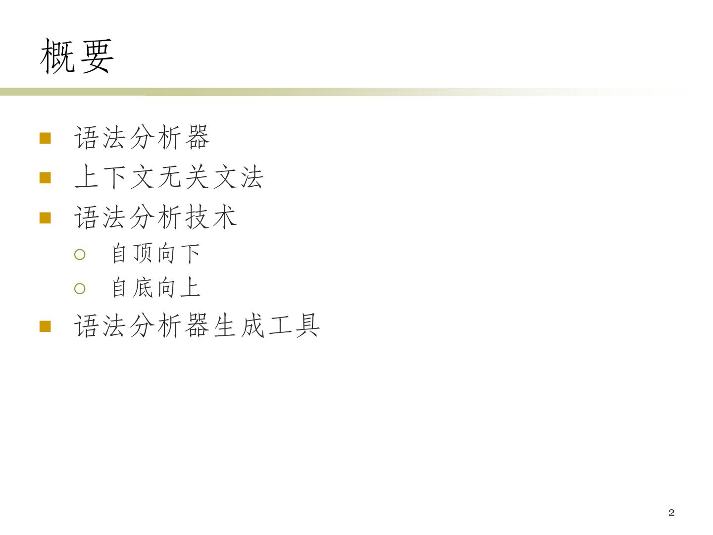 2 .概要 语法分析器 上下文无关文法 语法分析技术 自顶向下 自底向上 语法分析器生成工具 2