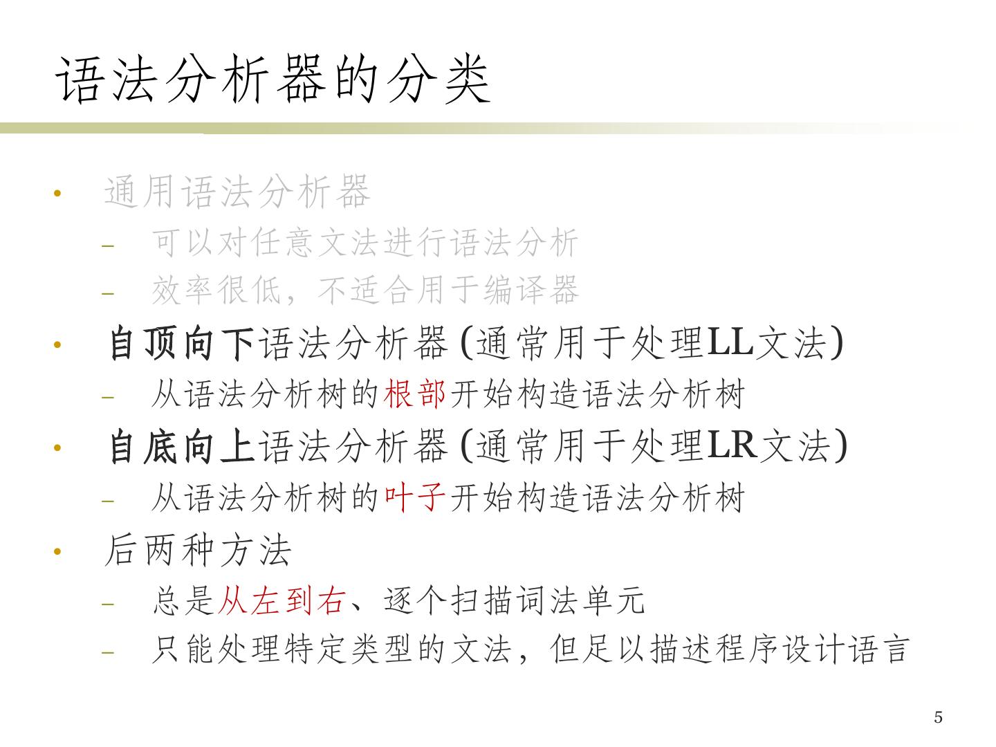 4 .语法分析器的作用 • 基本作用 – 从词法分析器获得词法单元的序列,确认该序列是否 可以由语言的文法生成 – 对于语法错误的程序,报告错误信息 – 对于语法正确的程序,生成语法分析树 (简称语法树) • 通常并不真的产生这棵语法分析树 4