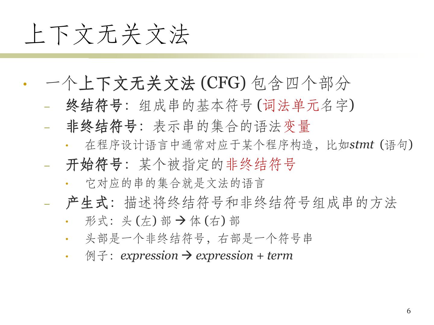 5 .语法分析器的分类 • 通用语法分析器 – 可以对任意文法进行语法分析 – 效率很低,不适合用于编译器 • 自顶向下语法分析器 (通常用于处理LL文法) – 从语法分析树的根部开始构造语法分析树 • 自底向上语法分析器 (通常用于处理LR文法) – 从语法分析树的叶子开始构造语法分析树 • 后两种方法 – 总是从左到右、逐个扫描词法单元 – 只能处理特定类型的文法,但足以描述程序设计语言 5