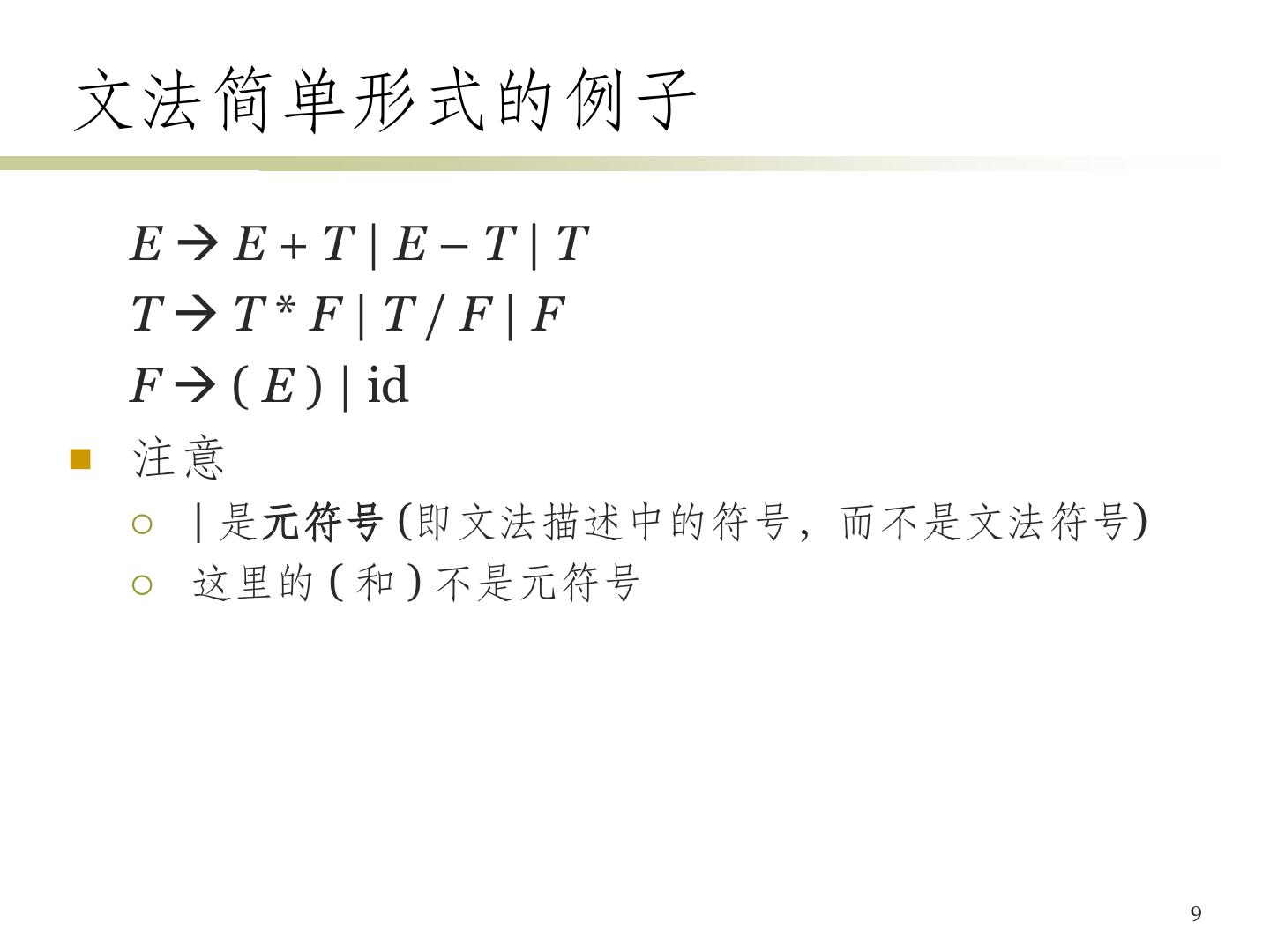 8 .文法简单形式的例子 EE+T|E–T|T TT*F|T/F|F F ( E ) | id 注意 | 是元符号 (即文法描述中的符号,而不是文法符号) 这里的 ( 和 ) 不是元符号 9