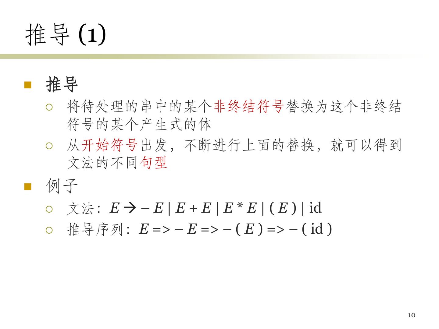 9 .推导 (1) 推导 将待处理的串中的某个非终结符号替换为这个非终结 符号的某个产生式的体 从开始符号出发,不断进行上面的替换,就可以得到 文法的不同句型 例子 文法:E – E | E + E | E * E | ( E ) | id 推导序列:E => – E => – ( E ) => – ( id ) 10
