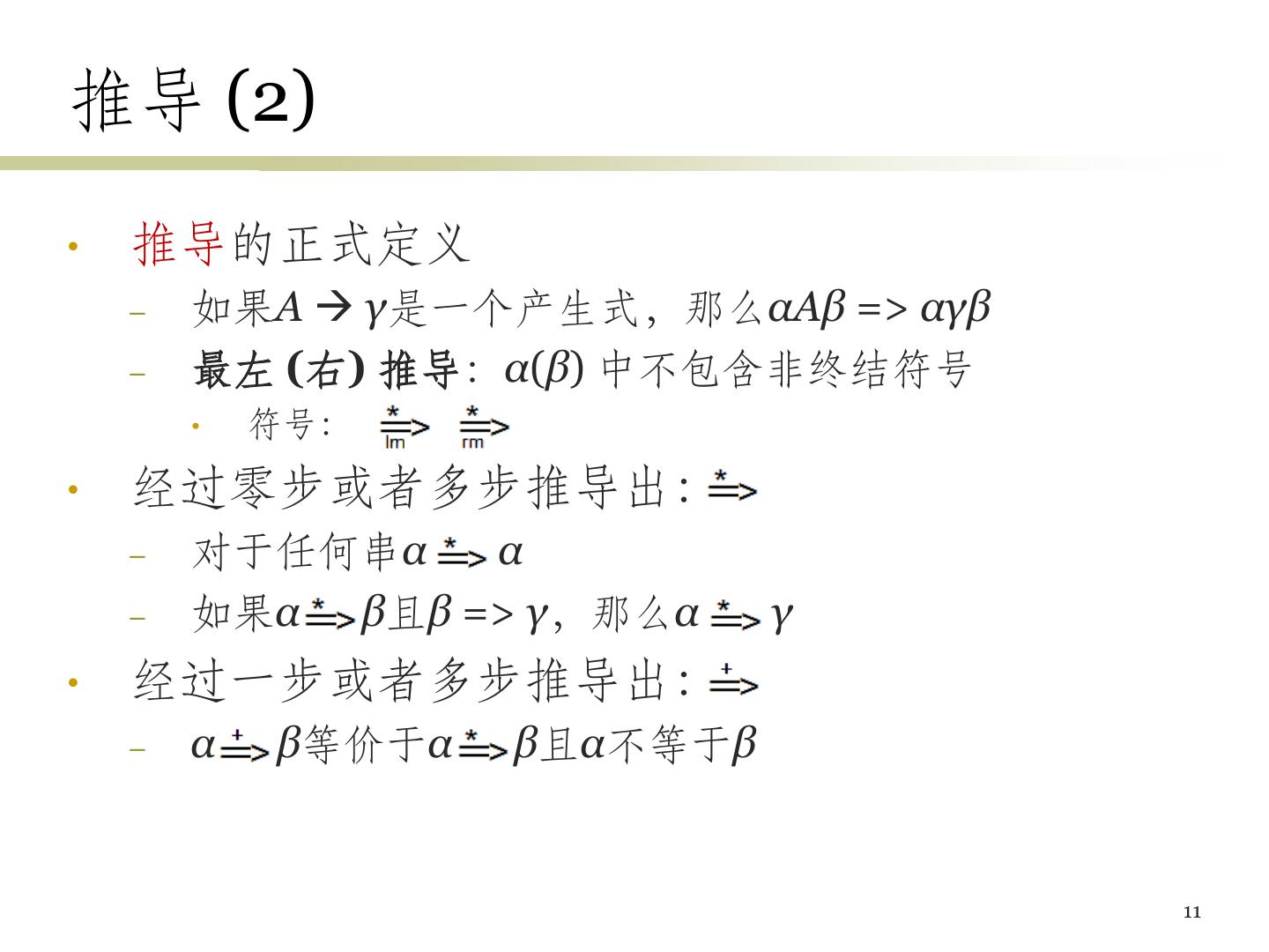 10 .推导 (2) • 推导的正式定义 – 如果A γ是一个产生式,那么αAβ => αγβ – 最左 (右) 推导:α(β) 中不包含非终结符号 • 符号: • 经过零步或者多步推导出: – 对于任何串α α – 如果α β且β => γ,那么α γ • 经过一步或者多步推导出: – α β等价于α β且α不等于β 11