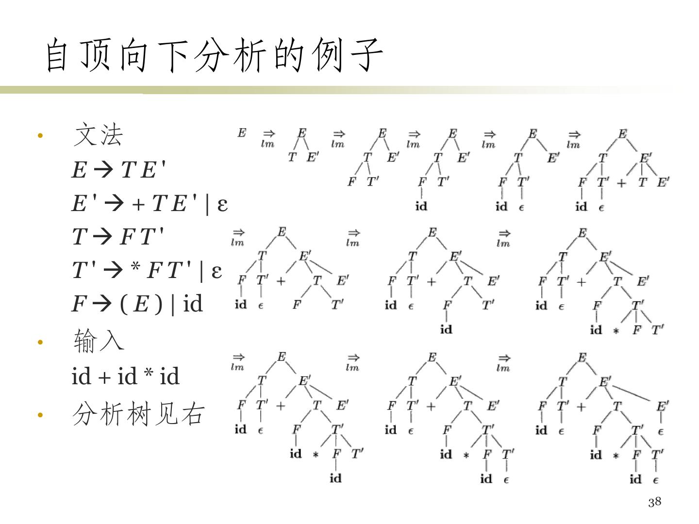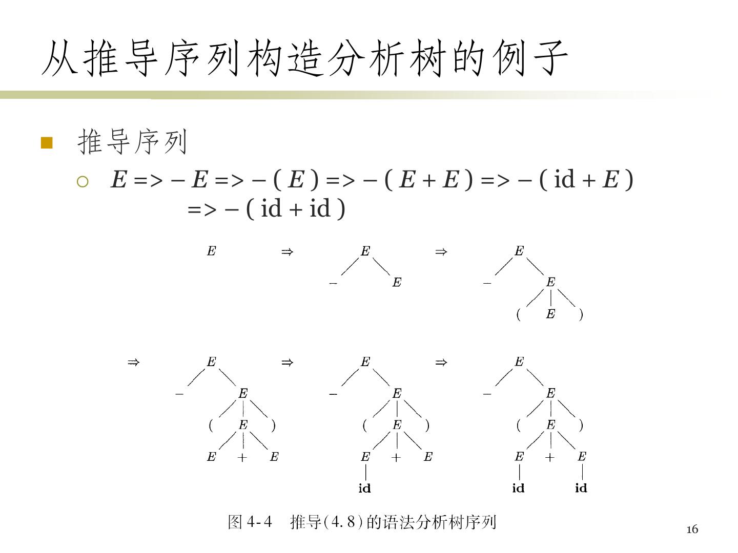 14 .从推导序列构造分析树的例子 推导序列 E => – E => – ( E ) => – ( E + E ) => – ( id + E ) => – ( id + id ) 16