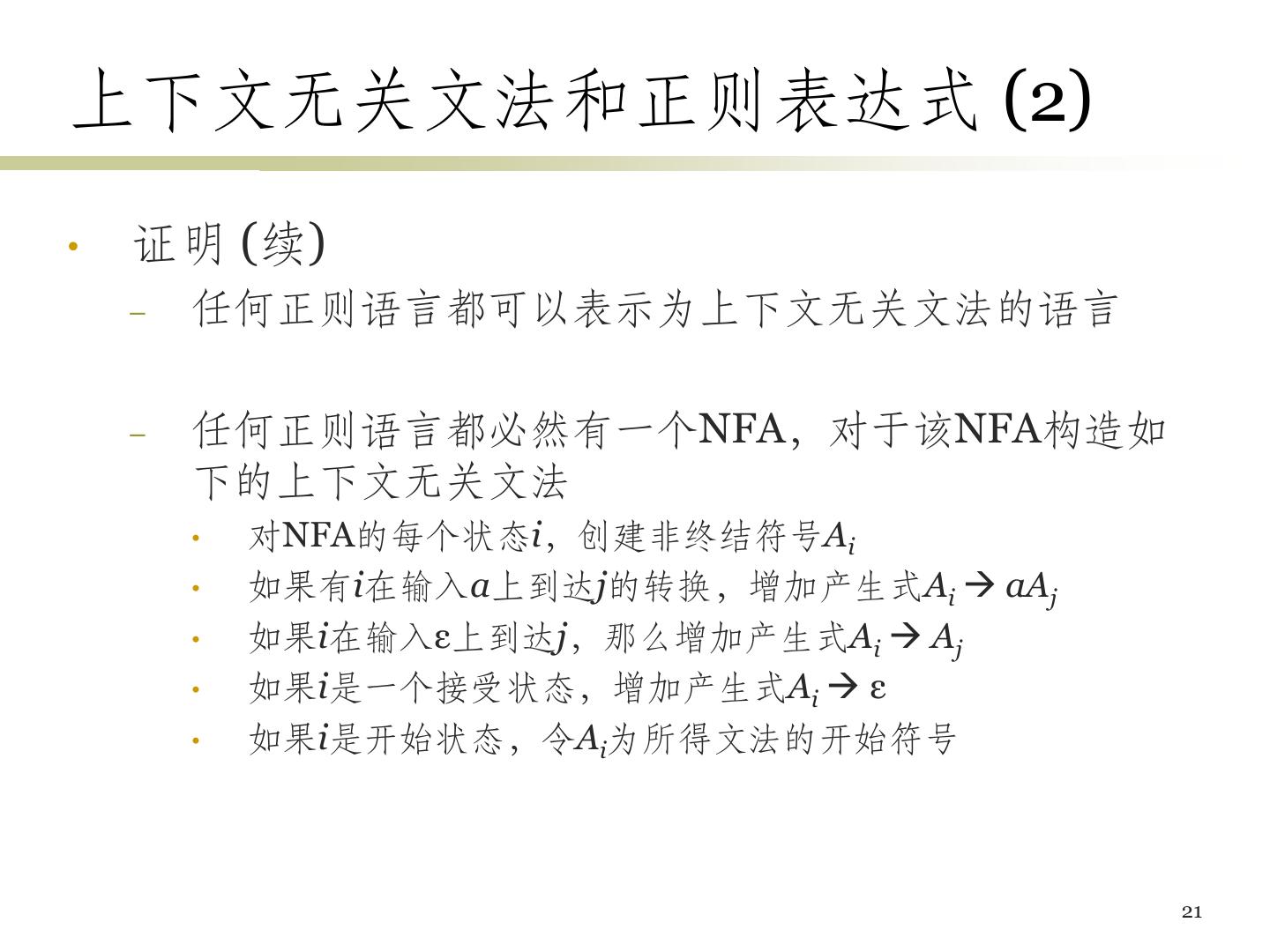 18 .上下文无关文法和正则表达式 (1) • 上下文无关文法比正则表达式的能力更强 – 所有的正则语言都可以使用文法描述 – 但有一些用文法描述的语言不能用正则表达式描述 • 证明 – 首先S aSb | ab描述了语言L {anbn | n > 0},但这个 语言无法用DFA识别 • 假设有DFA识别此语言L,且这个DFA有k个状态。那么在识 别ak+1…的输入串时,必然两次到达同一个状态。假设自动机 在第i个和第j个a时进入同一个状态,那么:因为DFA识别L, ajbj必然到达接受状态,因此aibj必然也到达接受状态。 • 直观地讲:有穷自动机不能计数 20