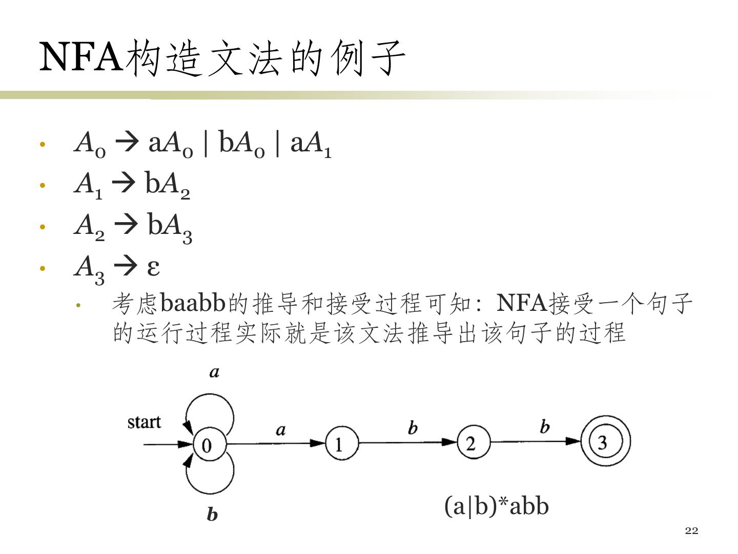 20 .NFA构造文法的例子 • A0 aA0 | bA0 | aA1 • A1 bA2 • A2 bA3 • A3 ε • 考虑baabb的推导和接受过程可知:NFA接受一个句子 的运行过程实际就是该文法推导出该句子的过程 b (a|b)*abb 22