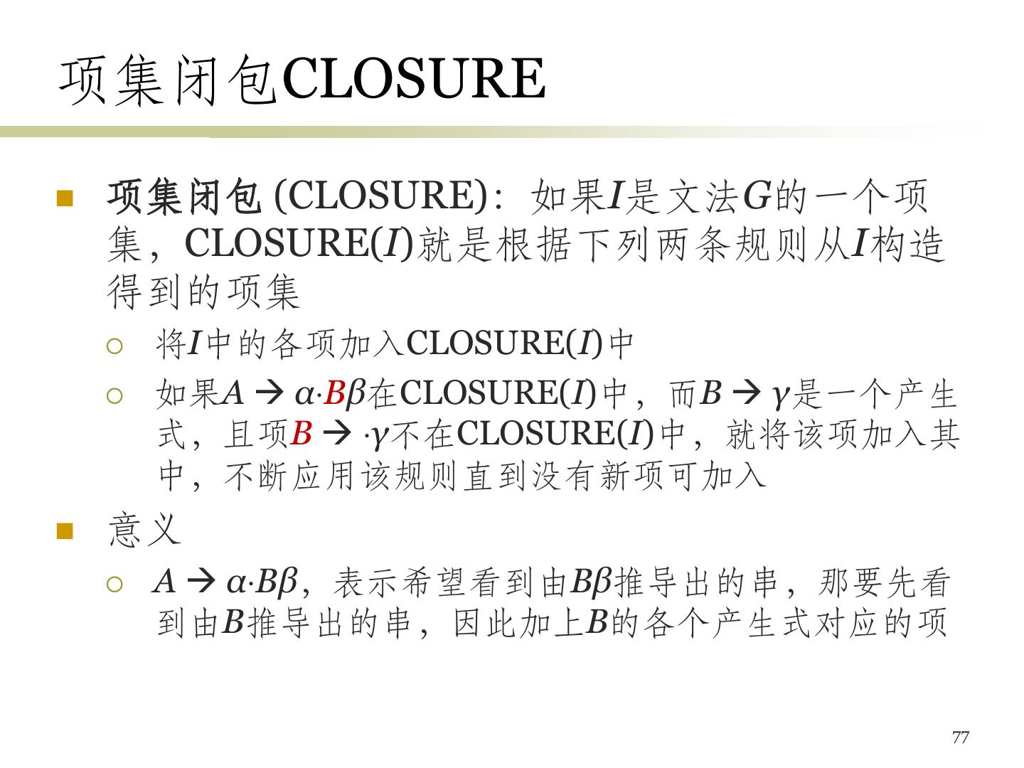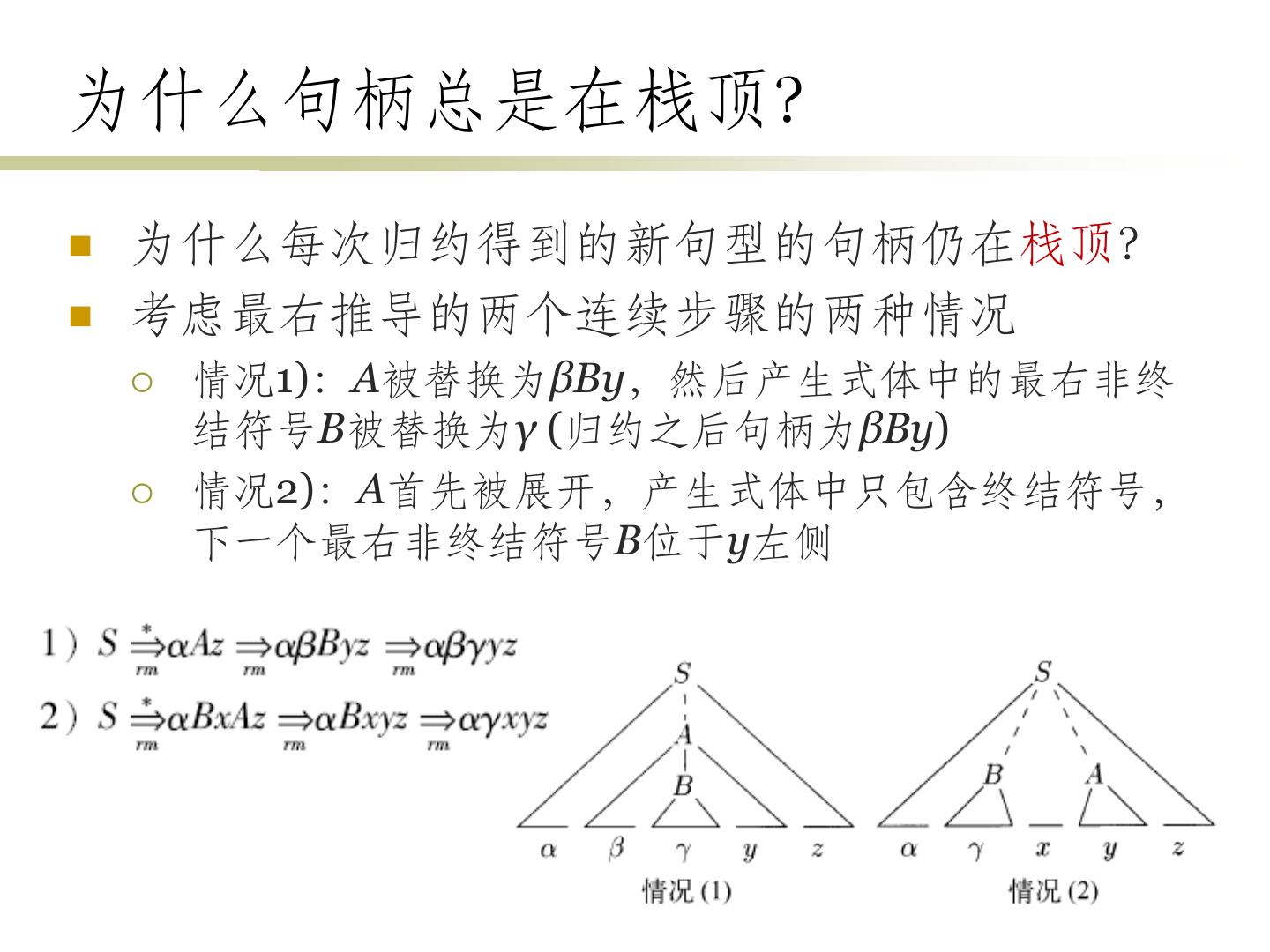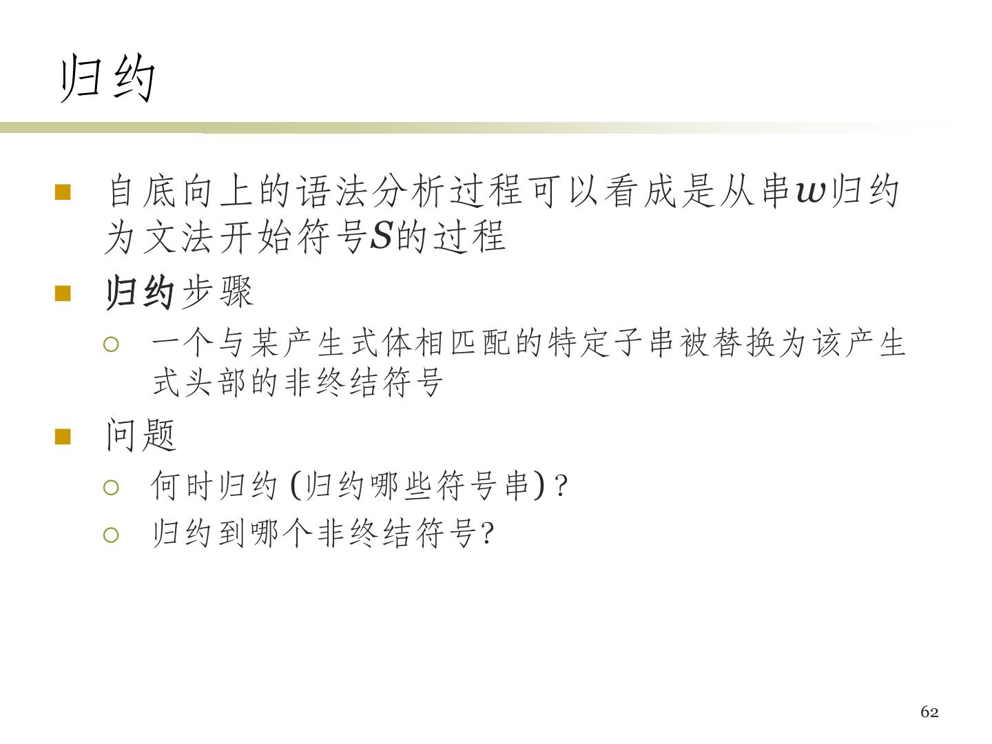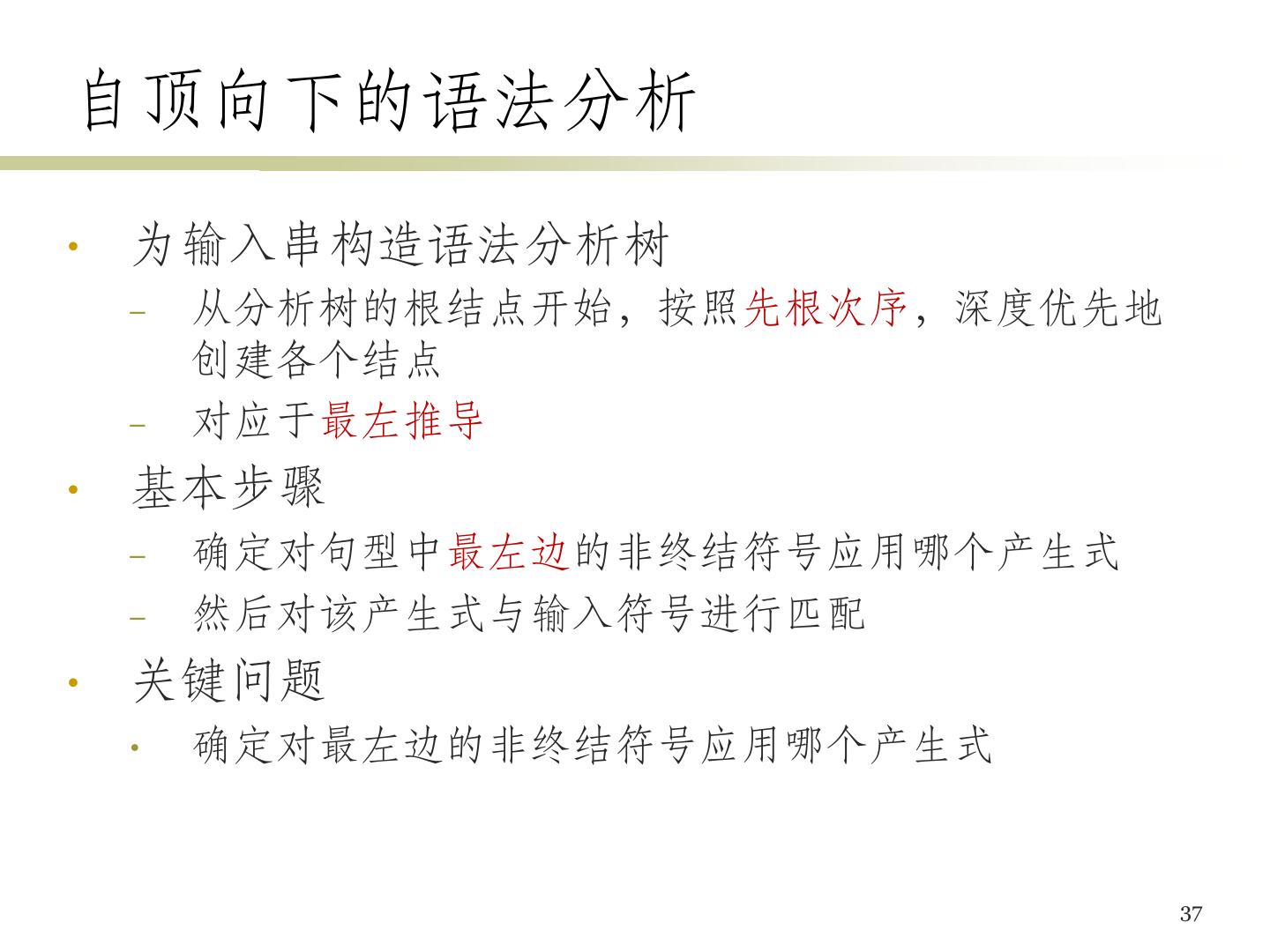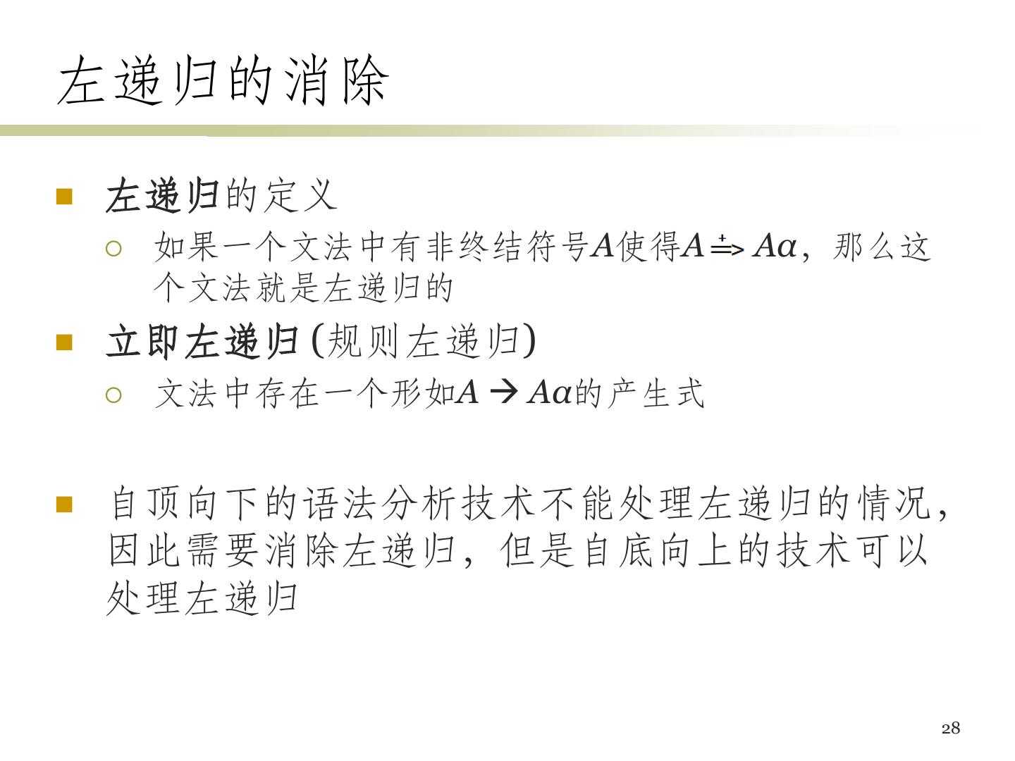 26 .左递归的消除 左递归的定义 如果一个文法中有非终结符号A使得A Aα,那么这 个文法就是左递归的 立即左递归 (规则左递归) 文法中存在一个形如A Aα的产生式 自顶向下的语法分析技术不能处理左递归的情况, 因此需要消除左递归,但是自底向上的技术可以 处理左递归 28