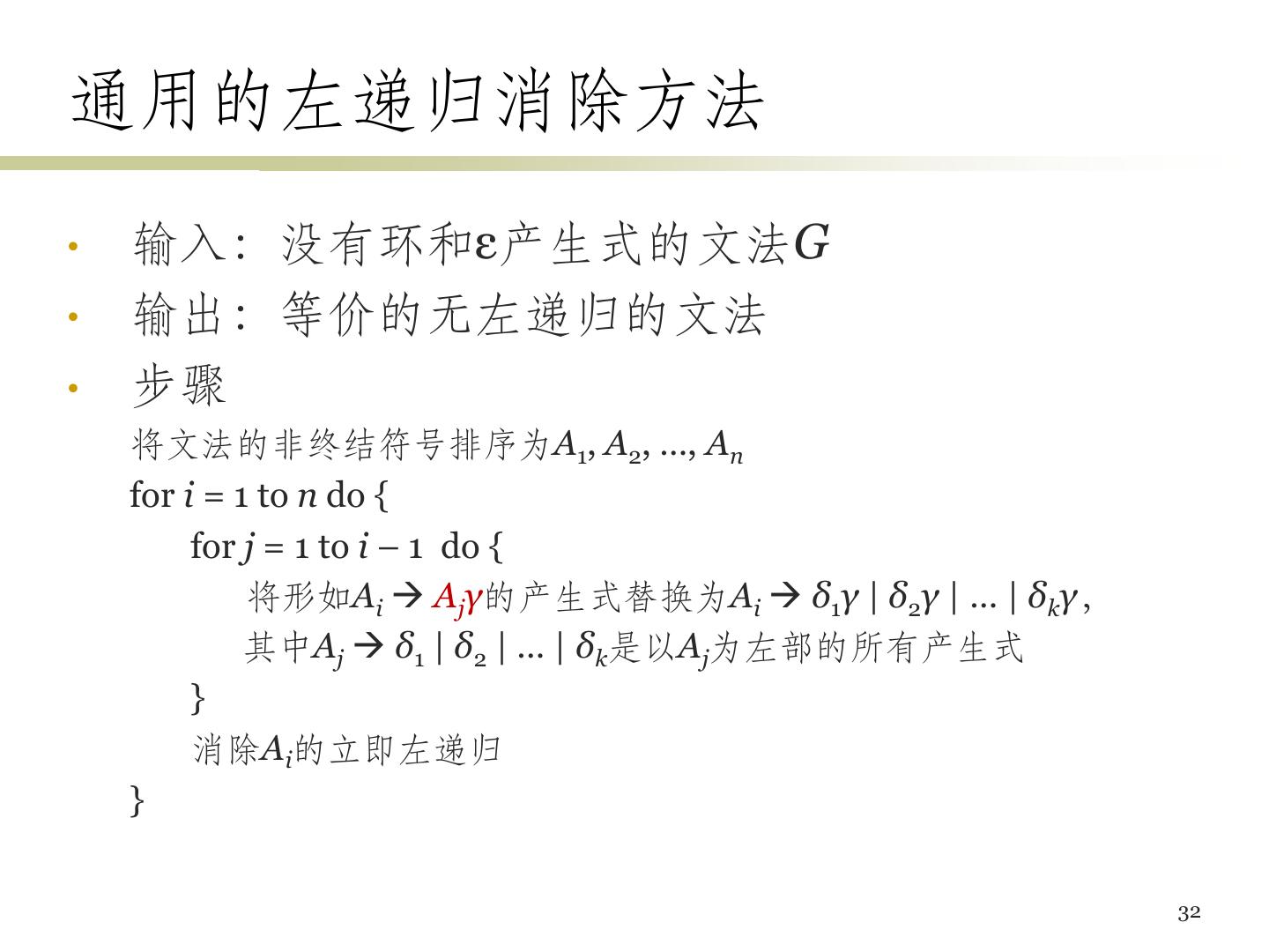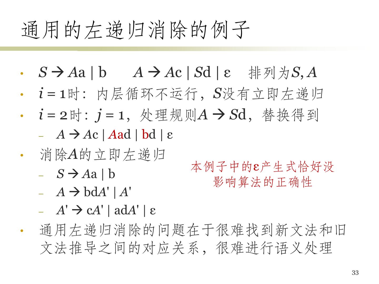 29 .消除多步左递归 消除立即左递归的方法并不能消除因为多步推导 而产生的左递归 文法:S Aa | b A Ac | Sd | ε S => Aa => Sda 如何消除? 31