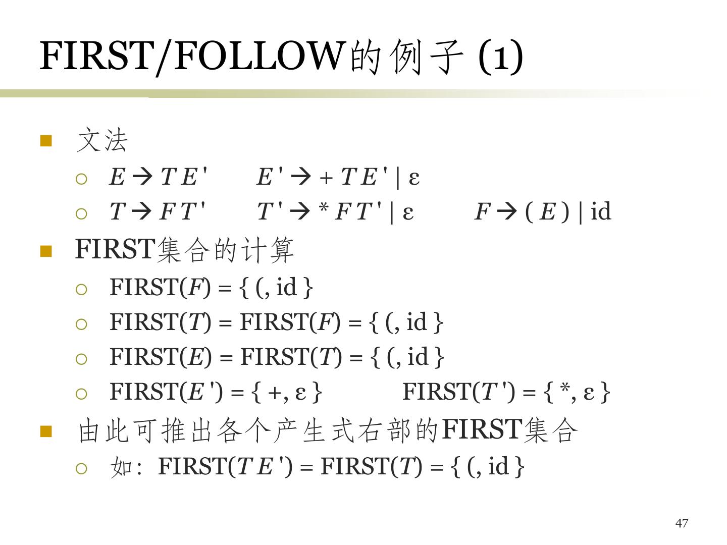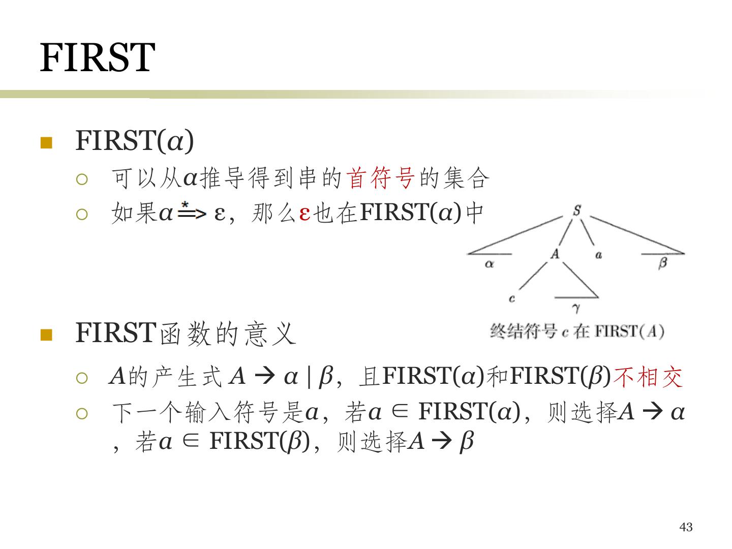 27 .立即左递归的消除 • 假设非终结符号A存在立即左递归 的情形 A Aα1 | … | Aαm | β1 | … | βn • 可替换为 A β1A' | … | βnA' A' α1A' | … | αmA' | ε A' • 观察:由A生成的串以某个βi开头, A' 然后跟上零个或多个αj A' A βA' A' A Aα | β A' αA' | ε 29