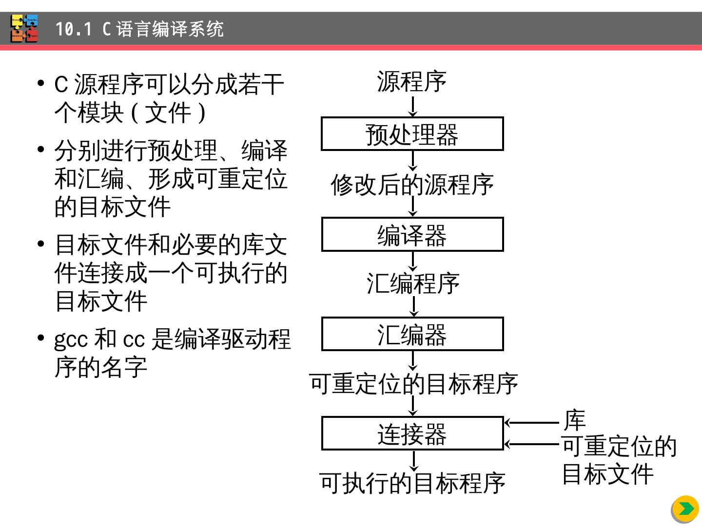 5 .1 0.1.1 预处理器 gcc 首先调用 预处理器 cpp , 将源程序文件翻译成一个 ASCII 中间文件,它是经修改后的源程序 cpp 实现以下功能 文件包含 宏展开 条件编译 10.1 C 语言编译系统