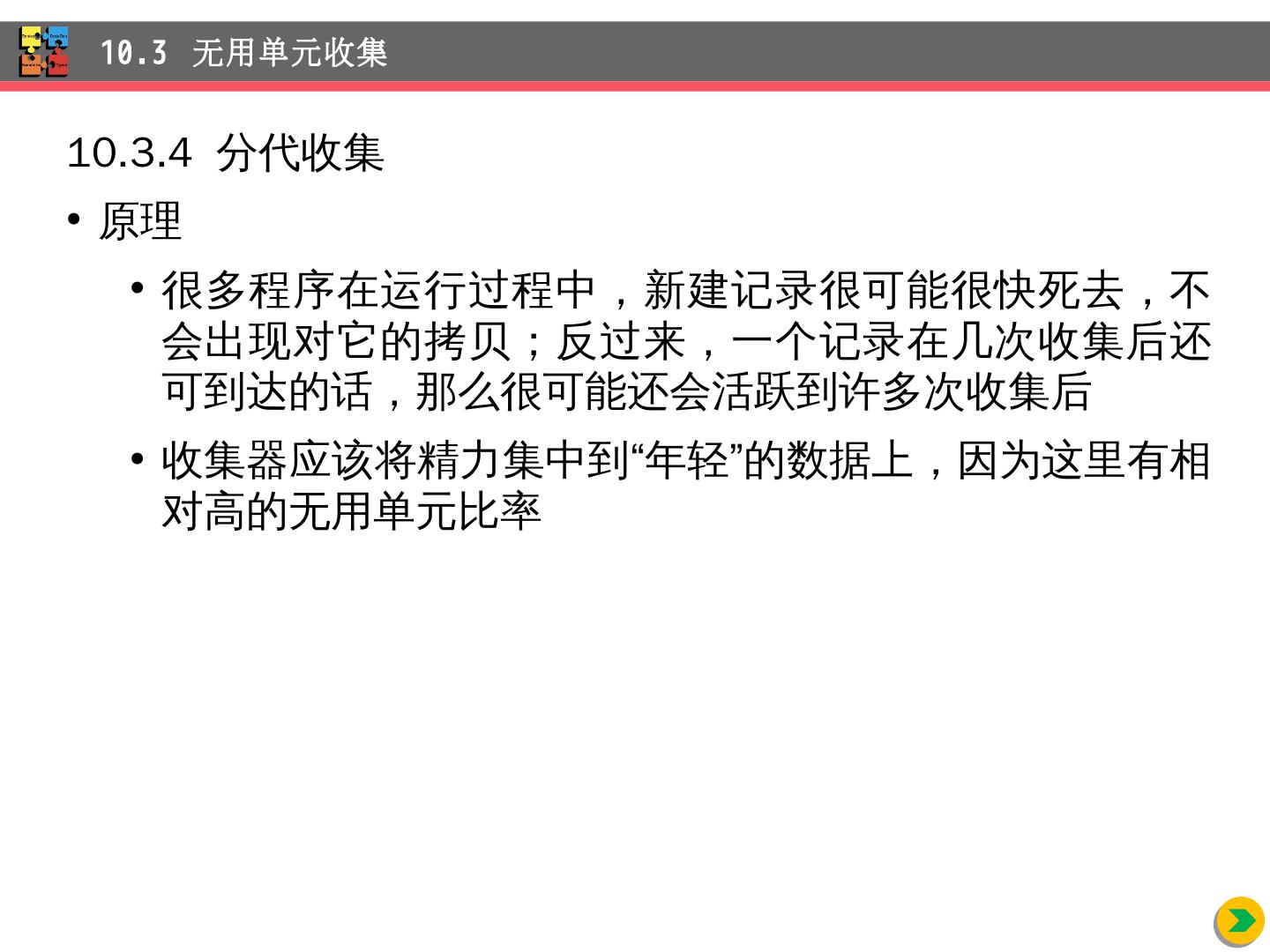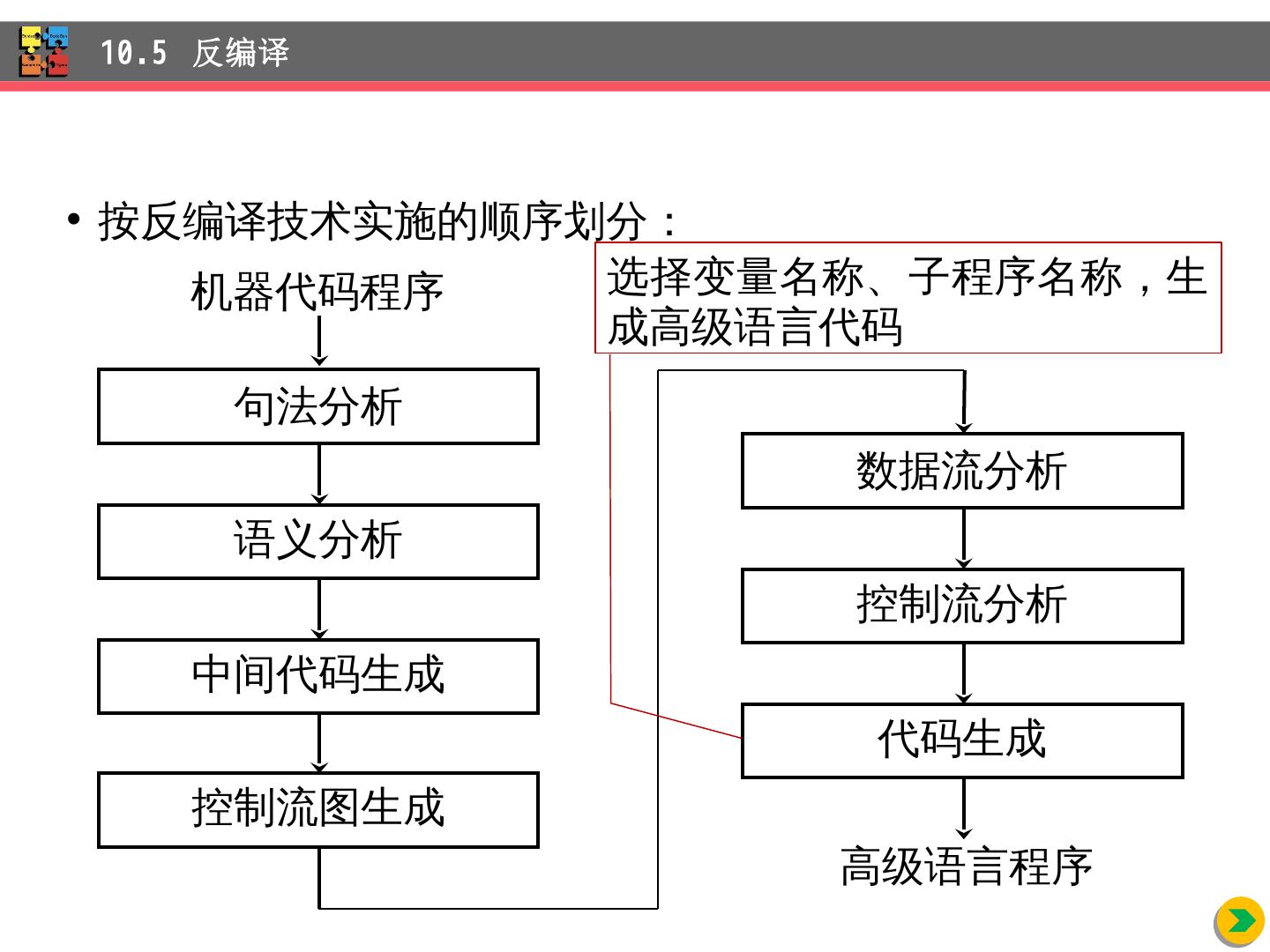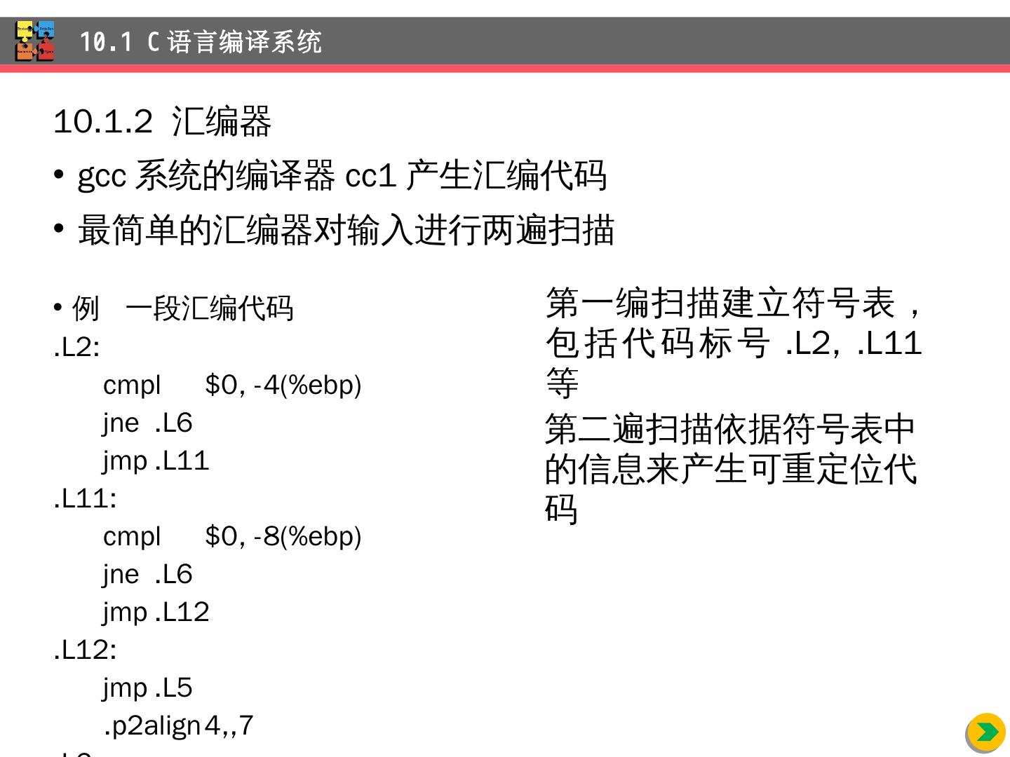 7 .1 0.1.2 汇编器 gcc 系统 的编译器 cc1 产生汇编代码 最简单的汇编器对输入进行两遍扫描 例 一段汇编代码 . L2 : cmpl $ 0 , - 4(% ebp ) jne .L6 jmp .L11 .L11 : cmpl $ 0 , - 8(% ebp ) jne .L6 jmp .L12 .L12: jmp .L5 .p2align 4 ,,7 .L6 : 10.1 C 语言编译系统 第一编扫描建立符号 表,包括 代码标号. L2, .L11 等 第二遍扫描依据符号 表中 的信息来产生可 重定位 代码