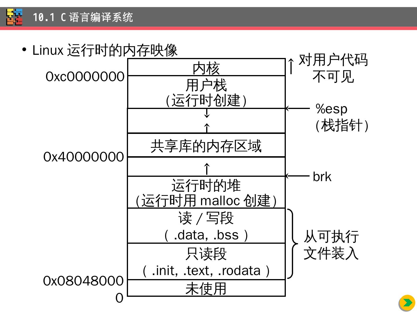 24 .Linux 运行时的内存映像 10.1 C 语言编译系统 内核 用户栈 (运行时创建) 共享库 的内存 区域 运行时的堆 (运行时用 malloc 创建) 读/写段 (. data, . bss ) 只读段 (. init, .text, .rodata) 未使用 0 xc0000000 0 x40000000 0 x08048000 对用户代码不可见 % esp (栈指针) brk 从可 执行 文件 装入 0
