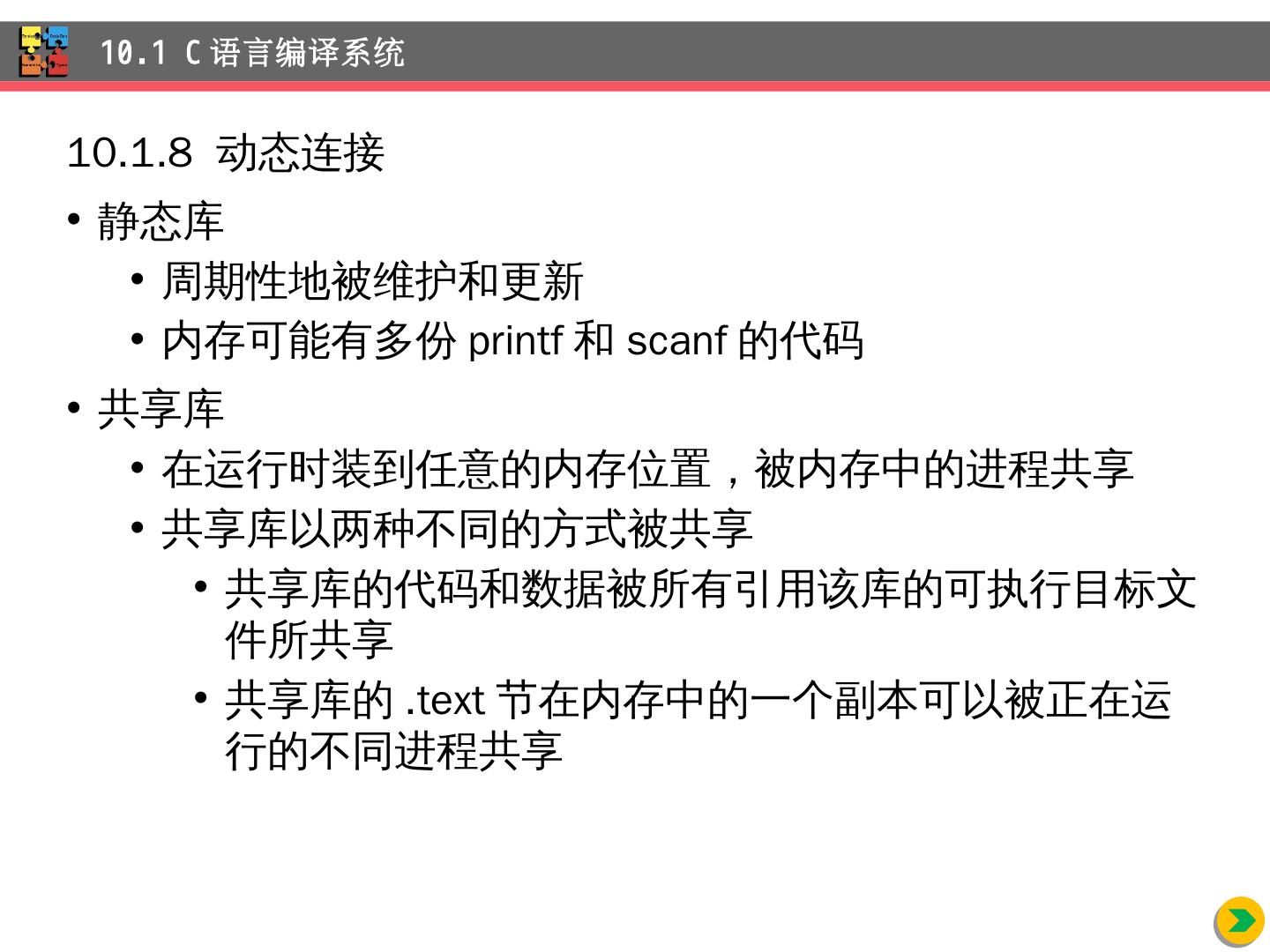 21 .1 0.1.6 静态库 将相关的可重定位目标模块打包成一个文件,作为连接器的输入 连接器仅复制库中被应用程序引用的模块 gcc c swap.c 编译 ar rcs mylib.a swap.o 建库 gcc static o swap1 main.c / usr /lib/ libc.a mylib.a 生成可执行文件 10.1 C 语言编译系统
