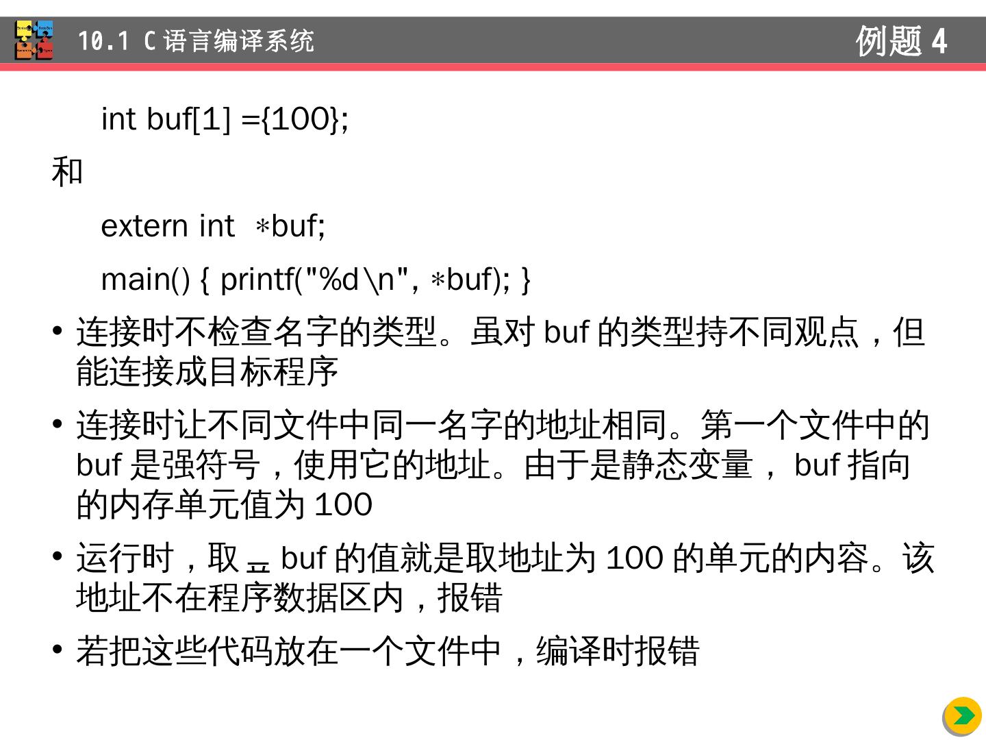 6 .10.1 C 语言编译系统 main.c (1) #if 1 (2) int buf [2]; (3) #else (4) int buf [2] = {10,20}; (5) # endif (6) void swap(); (7) #define A buf [0] (8) int main() (9) { (10) scanf ("%d, %d", buf , buf+1); (11)swap(); (12) printf ("%d, %d ", A , buf [1]); (13)return 0; (14) } swap.c (1) extern int buf [2]; (2) int *bufp0 = buf ; (3) int *bufp1; (4) void swap() (5) { (6) int temp; (7)bufp1 = buf+1; (8)temp = *bufp0; (9)*bufp0 = *bufp1; (10)*bufp1 = temp; (11) }