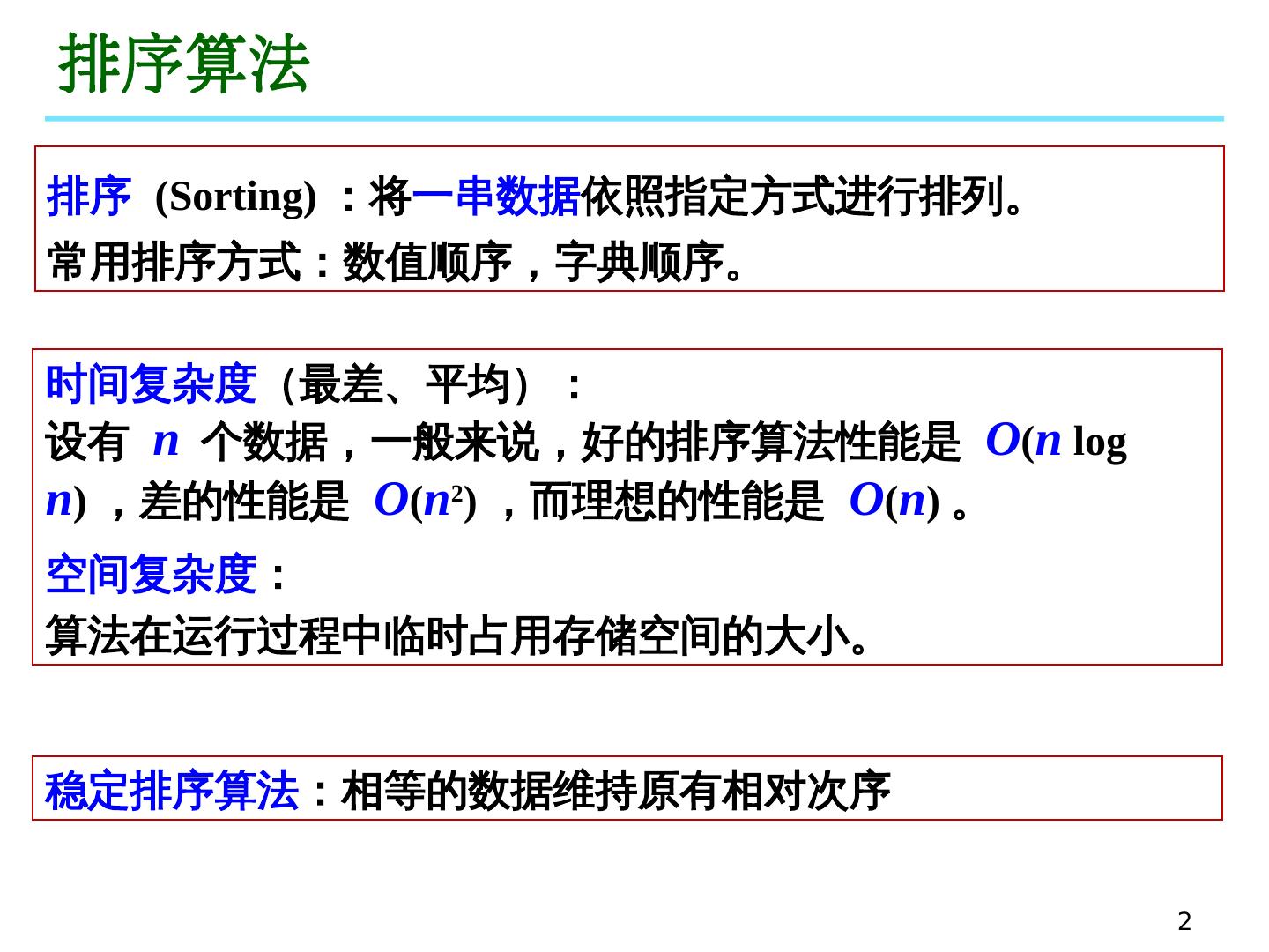 2 .2 排序算法 排序 (Sorting) :将 一串数据 依 照指定方式进行排列。 常用排序 方 式:数 值顺 序,字 典顺序 。 时 间复杂度 (最差、平 均): 设有 n 个数据,一般 来说 , 好 的排序算法性 能 是 O ( n log n ) ,差的 性能 是 O ( n 2 ) ,而理 想的性能 是 O ( n ) 。 空间复杂度 : 算法在运行过程中临时占用 存储空间的大小。 稳定排序算 法 :相等的数据维持原有相 对次序