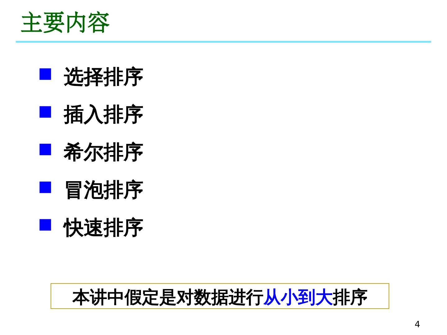 4 .4 主要内容 选择排序 插入排序 希 尔排序 冒泡排序 快速排序 本讲中假定是对数据进行 从小到大 排序