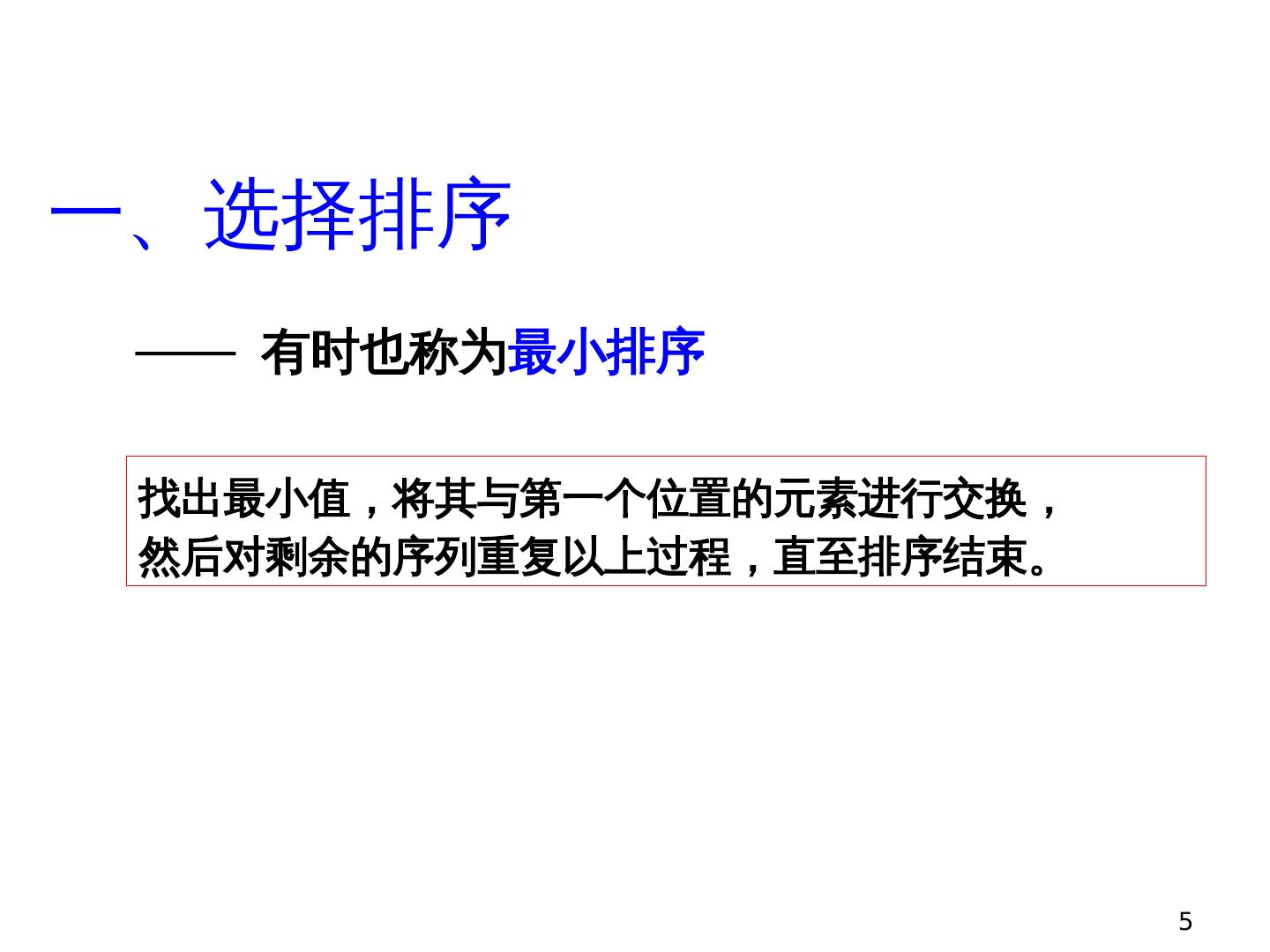 5 .5 一 、选择排 序 找出最小值,将其与第一个位置的 元素进行交换, 然后 对剩余的序列重复以上过程,直至排序结束。 —— 有时也称为 最小排序