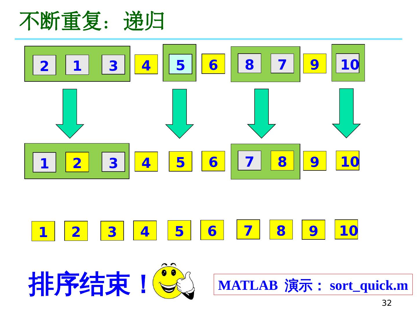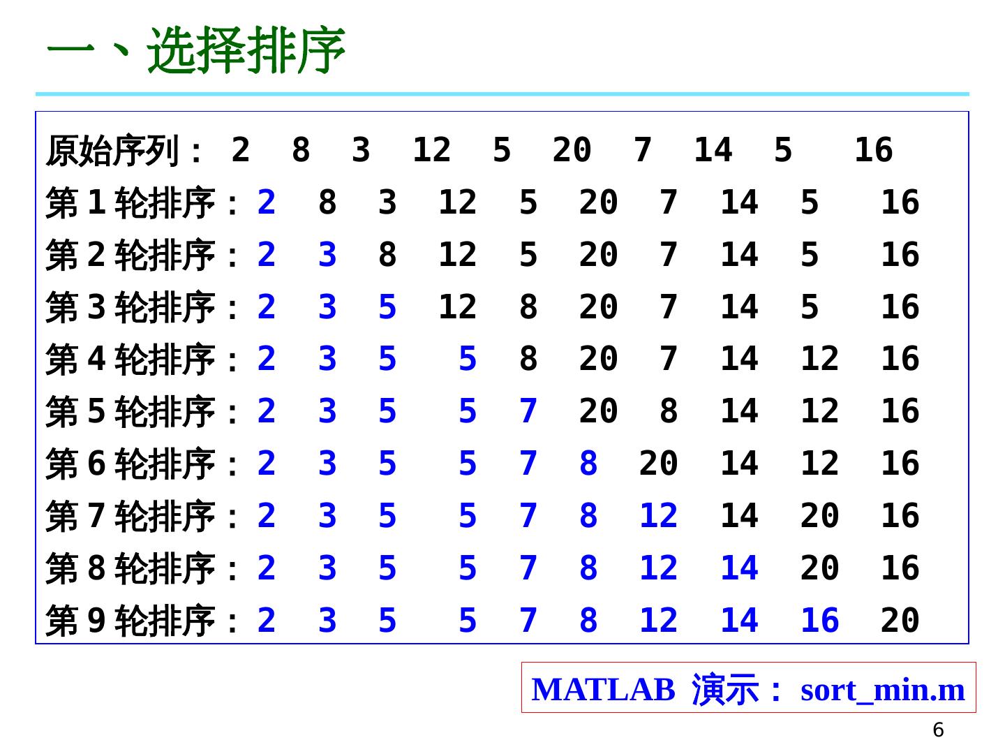 6 .6 一 、选择排 序 原 始 序 列 : 2 8 3 12 5 20 7 14 5 16 第1 轮 排序 : 2 8 3 12 5 20 7 14 5 16 第2 轮 排序 : 2 3 8 12 5 20 7 14 5 16 第3 轮 排序 : 2 3 5 12 8 20 7 14 5 16 第4 轮 排序 : 2 3 5 5 8 20 7 14 12 16 第5 轮 排序 : 2 3 5 5 7 20 8 14 12 16 第6 轮 排序 : 2 3 5 5 7 8 20 14 12 16 第7 轮 排序 : 2 3 5 5 7 8 12 14 20 16 第8 轮 排序 : 2 3 5 5 7 8 12 14 20 16 第9 轮 排序 : 2 3 5 5 7 8 12 14 16 20 MATLAB 演示 : sort_min.m