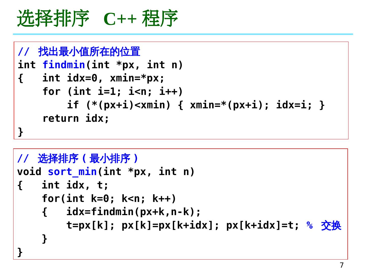 7 .7 选择 排序 C ++ 程序 // 找出最小值所在的位置 int findm in ( int * px , int n) { int idx =0, xmin =* px ; for ( int i =1; i <n; i ++) if (*( px+i )< xmin ) { xmin =*( px+i ); idx = i ; } return idx ; } // 选择排序 ( 最小排序 ) void sort_ m in ( int * px , int n) { int idx , t; for( int k=0; k<n; k++) { idx = findm in ( px+k,n-k ); t= px [k]; px [k]= px [ k+idx ]; px [ k+idx ]=t; % 交换 } }
