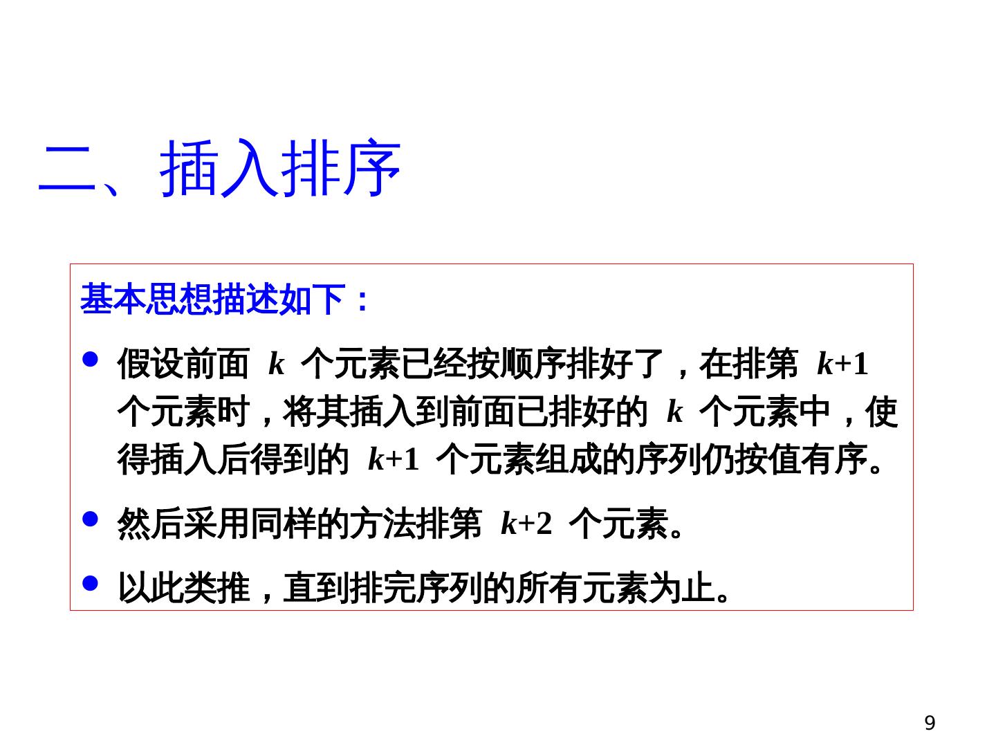 9 .9 二、插入排序 基本思想描述如下: 假设 前面 k 个元素已经按顺序排好了,在排第 k +1 个元素时 ,将其插入到前面已排好的 k 个元素中 ,使得插入后得到的 k +1 个元素组成 的序列仍按值有序 。 然后采用同样的方法排第 k +2 个元素。 以此类推,直到排完 序列的所有元素为止。