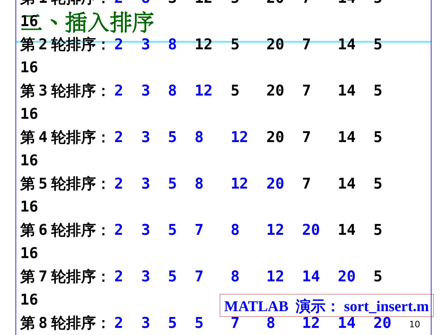 10 .10 二、插入排序 原 始序列 : 2 8 3 12 5 20 7 14 5 16 第 1 轮排序 : 2 8 3 12 5 20 7 14 5 16 第 2 轮排序 : 2 3 8 12 5 20 7 14 5 16 第 3 轮排序 : 2 3 8 12 5 20 7 14 5 16 第 4 轮排序 : 2 3 5 8 12 20 7 14 5 16 第 5 轮排序 : 2 3 5 8 12 20 7 14 5 16 第 6 轮排序 : 2 3 5 7 8 12 20 14 5 16 第 7 轮排序 : 2 3 5 7 8 12 14 20 5 16 第 8 轮排序 : 2 3 5 5 7 8 12 14 20 16 第 9 轮排序 : 2 3 5 5 7 8 12 14 16 20 MATLAB 演示 : sort_insert.m