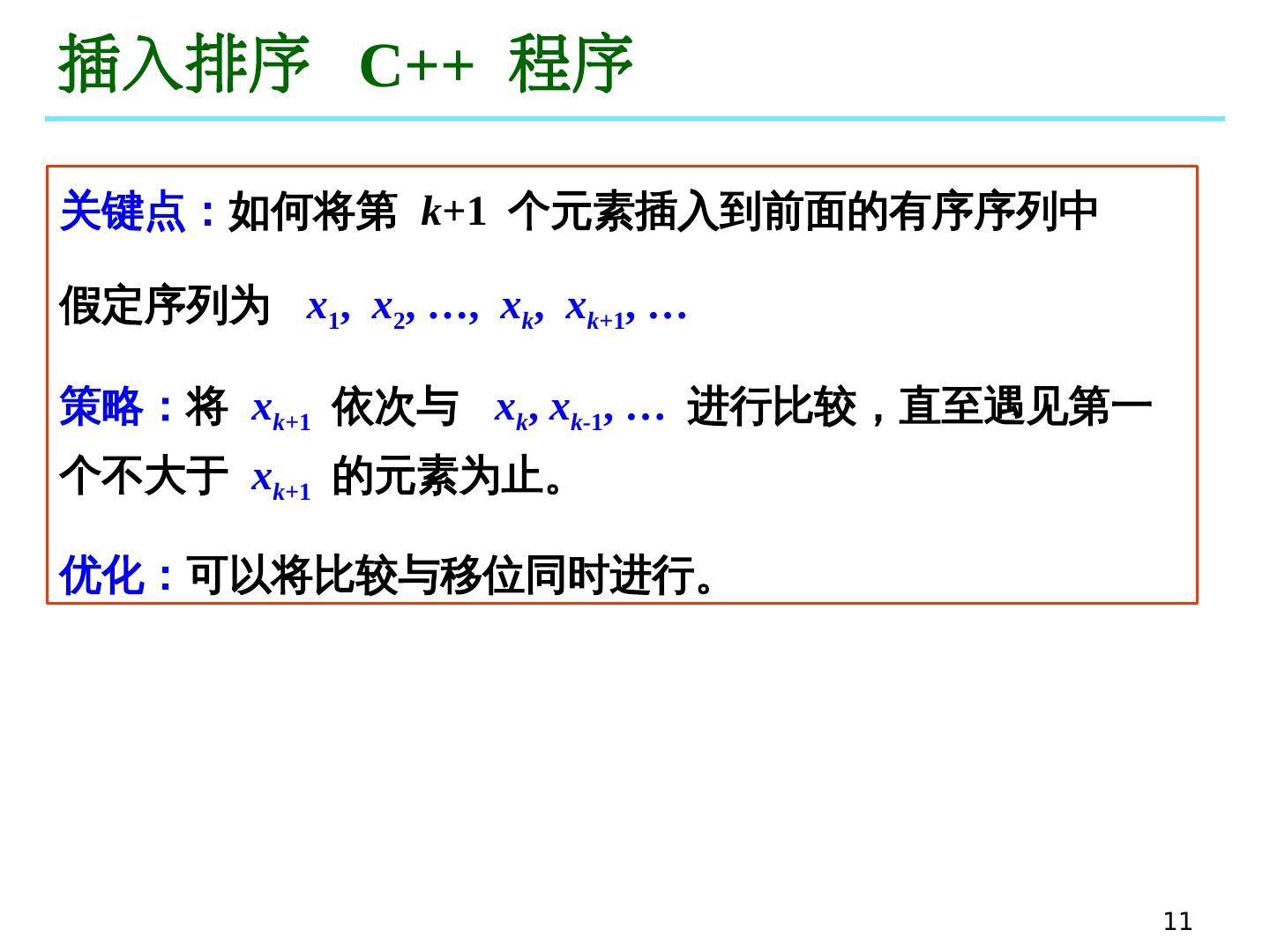 11 .11 插入排序 C++ 程序 关键点: 如何将第 k +1 个元素插入到前面的有序 序列中 假定 序列 为 x 1 , x 2 , …, x k , x k +1 , … 策略: 将 x k +1 依次与 x k , x k- 1 , … 进行比较,直至遇见第一个不大于 x k +1 的元素为止。 优化: 可以将比较与移位同时进行。