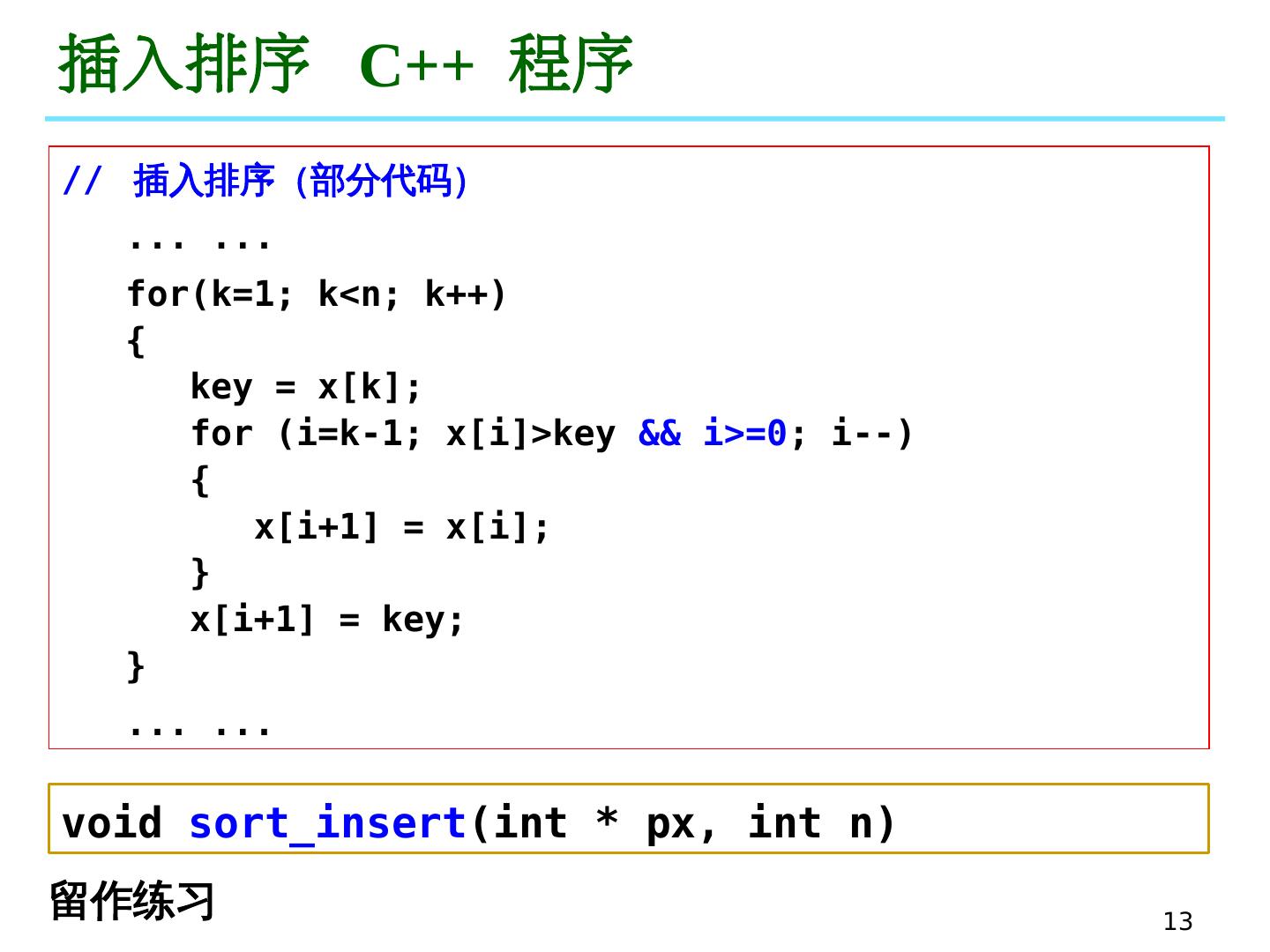 13 .13 插入排序 C++ 程序 // 插入排序(部分代码) ... ... for(k=1 ; k<n; k++) { key = x[k]; for (i=k-1 ; x[i]> key && i >=0 ; i--) { x[i+1] = x[i]; } x[i+1] = key; } ... ... void sort_insert ( int * px , int n) 留作练习